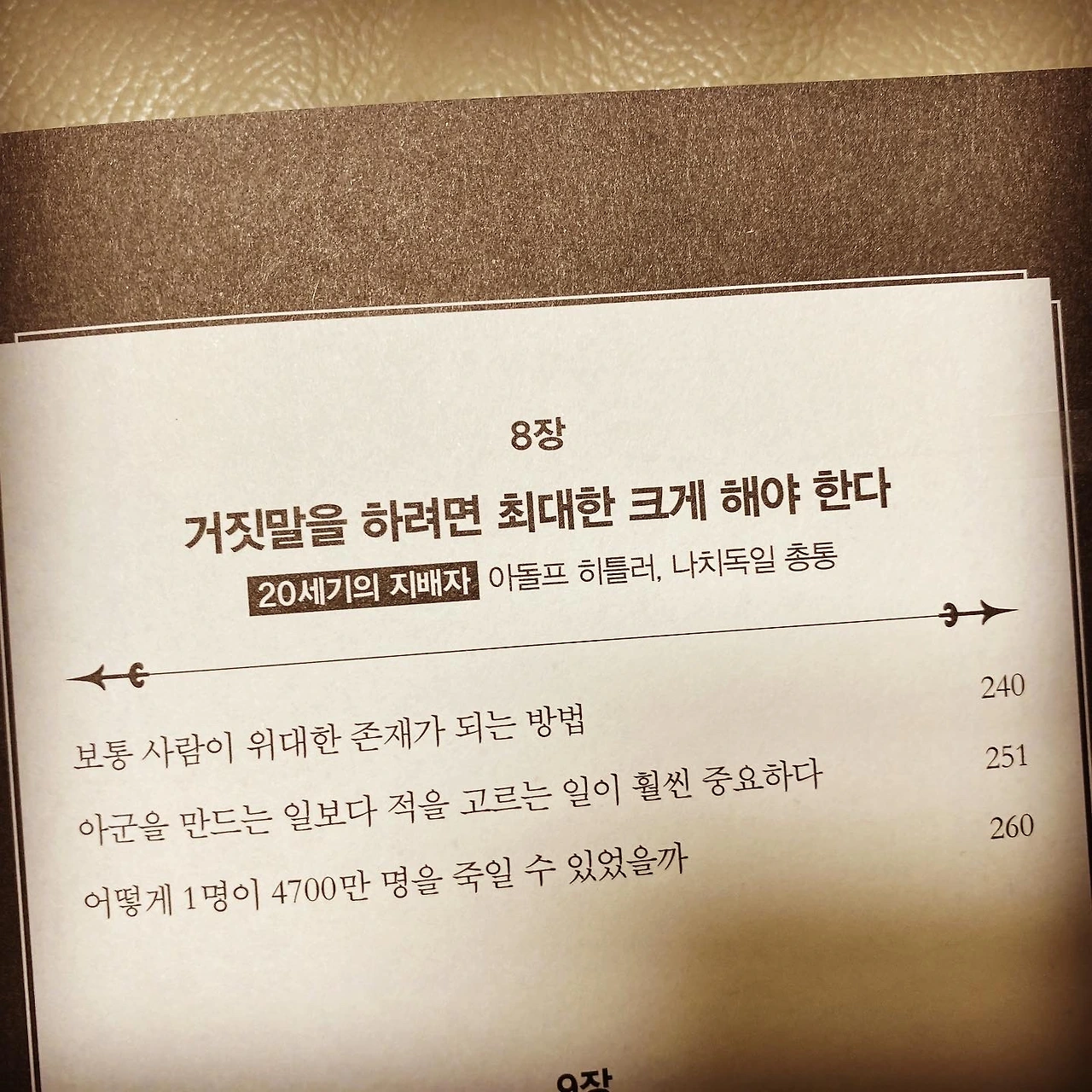 특히 히틀러 부분은 상당히 인상적이었다. 삼자적 입장에서 당시 독일국민이 그렇게 열광할 만한 매력이 숨겨 있지 않았을까 조심스레 상상하곤 했는데 그냥 이놈은 개ㅂㅅ이었다.(별다른표현이 떠오르지 않는다) 그렇다면 왜 이런 ㅂㅅ에게 독일의 우수 인재들이 감동하며 충성을 바쳤을까? 자세한 내용은 책을 통해 알아가길 바라며 굳이 한 문장으로 요약하자면 ‘사람은 자신이 가진것만으로 삶이 결정되지 않는다’는 정도일 것이다. 이건 정말 좋게 교훈적으로 이야기한 것이고 좀 더 현실적이고 네거티브하게 하자면 ‘사람들이 원하는 말을 최대한 거짓으로 부풀려 이야기하라’ 이다. 위 두 문장이 잘 이어지지는 않지만 이 책을 읽는다면 한 부족하디 부족한 인간의 달콤한 거짓말이 자국과 전 인류에 어떤 영향을 미쳤는지 정도는 알게 될 것이다.