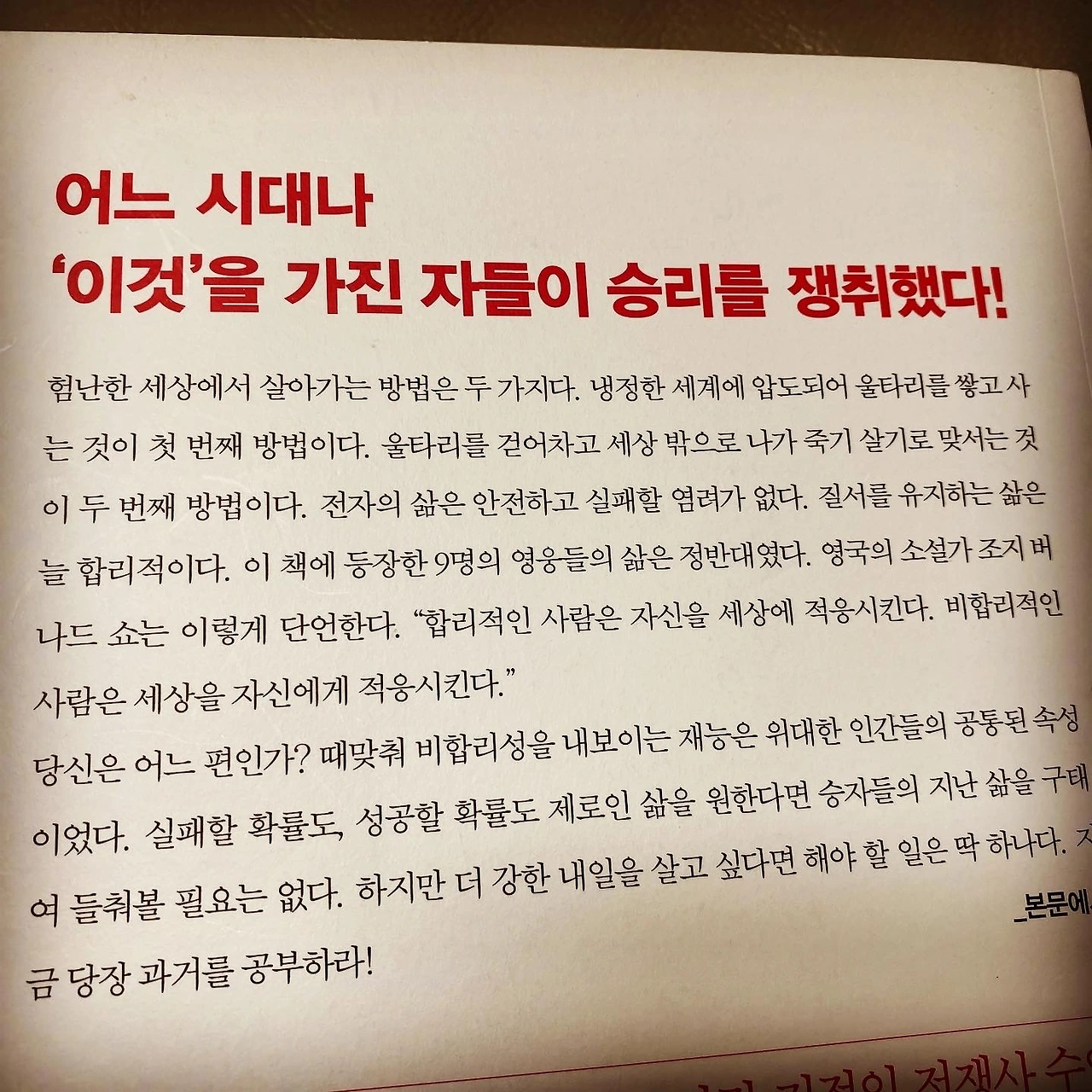무엇보다 나폴레옹, 처칠, 대처 등 승자의 입장에서 비교적 우호적인 평가를 받는 역사 속 인물들의 가치관을 엿볼 수 있어 좋았다. 책의 말미에는 책 속 영웅들과 빌런들의(승자?) 공통점을 정리해주는데 가슴에 와 닿았다. 그리고 그 내용이 일반적이지 않았다. 시스템에 안주하는 자와 시스템을 지배하는 자, 승자는 바로 거기에서부터 시작된다. 이래서 역사 공부가 중요한가보다.