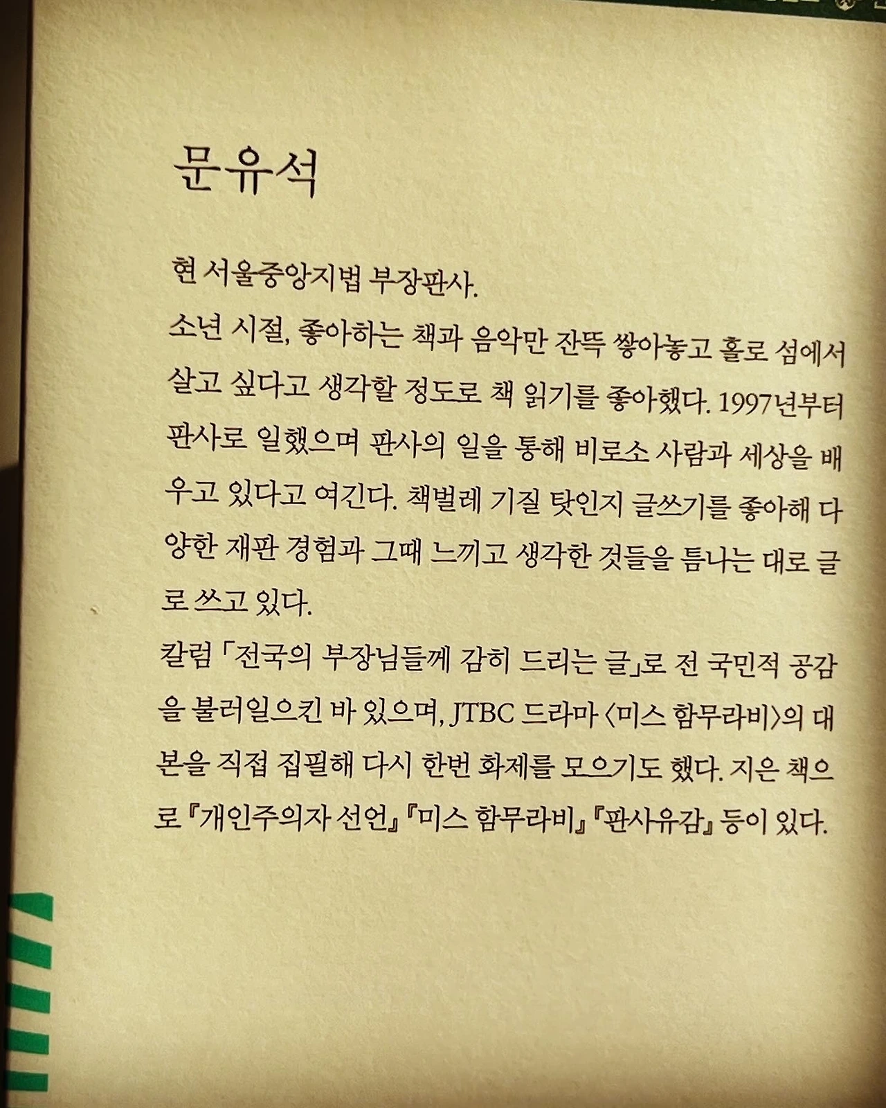 이 책에는 ‘슬램덩크’, ‘서유기’, 이문열, 하루키, 시드니 셀던 등 나의 유년 시절과 교집합 키워드가 꽤나 등장한다. 그리고 그 작품들에서 느낀 점들이 인생의 진부함을 구차하게 나열한 것이 아니라, 책을 좋아하는 공부벌레가 유쾌하게 책 덕질의 좋은 점을 침튀기며 소개한다. 그래서 문 판사님의 독서 리스트에서 나의 취향을 저격할 다음 책을 찾아낼 수 있었다. 아마 김용의 작품들을 읽게 될 것 같다.