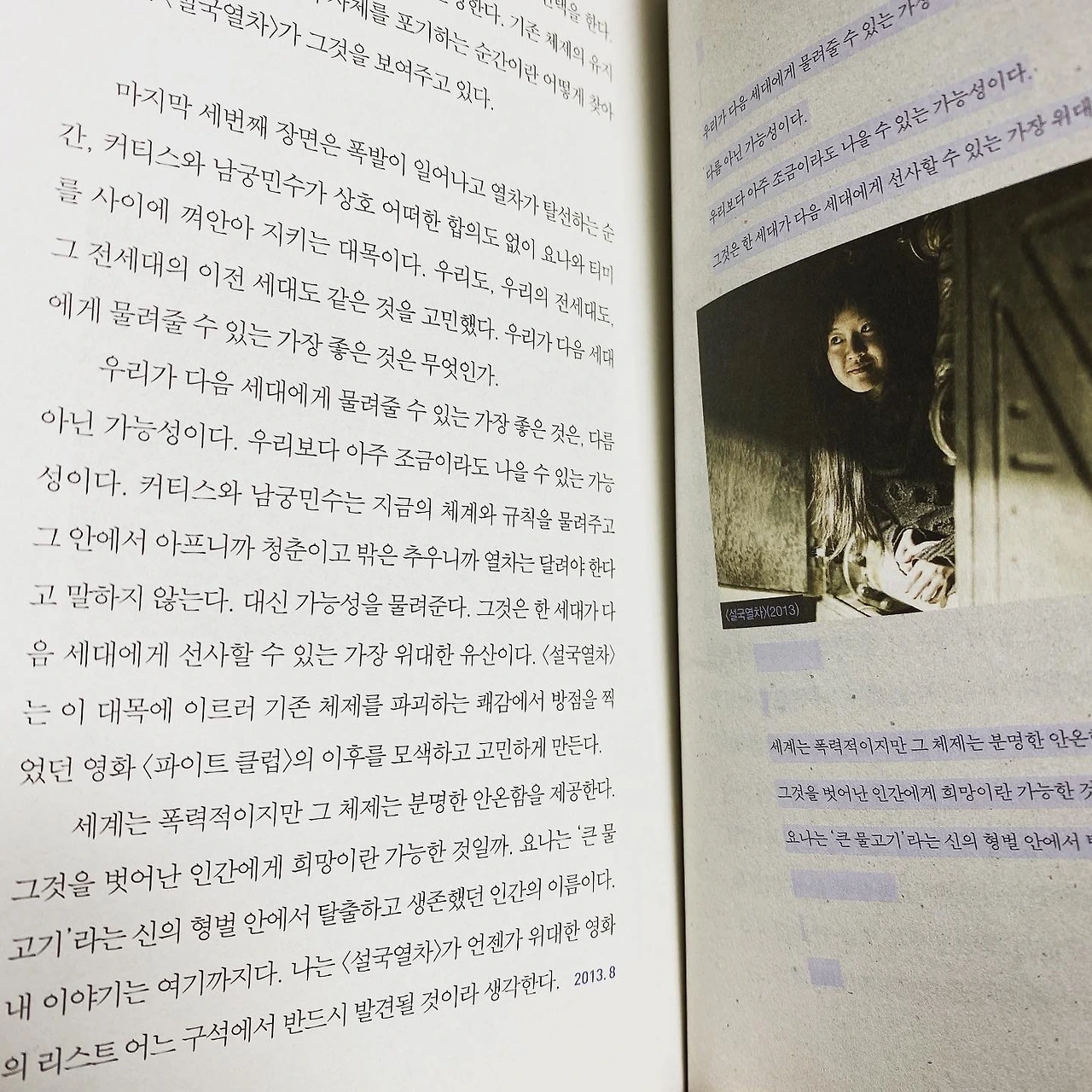 갑자기 예전 생각이 나면서 영화를 보고 싶어졌다. 그의 글을 읽고 있자니 어릴 적 수많은 영화가 나에게 던져 주었던 질문들이 그리워졌다. 난 그 질문들의 답을 찾기 위한 여정으로 살아가고 있는 게 아닐까 생각이 든다. 영화가 나에게 어떤 의미였는지 다시금 떠오르게 한 그의 글에 감사함을 느낀다. 질문 던지기, 대중문화의 인문학적 역할은 이것이 아닐까? 요즘은 너무 쾌락적이라는 느낌이 든다. 하다못해 책에 소개된 이나중 탁구부를 보면서도 웃겨서 울고, 슬퍼서 울고, 감동적이어서 울고 했었는데 말이다.