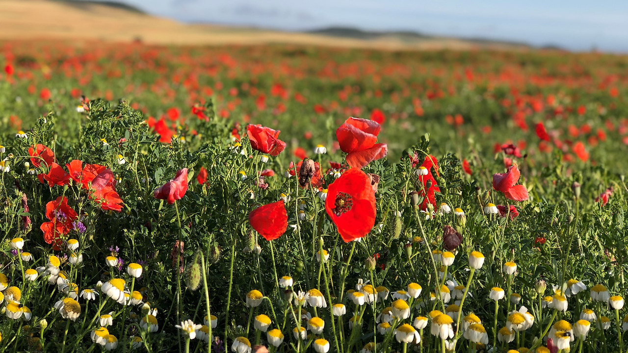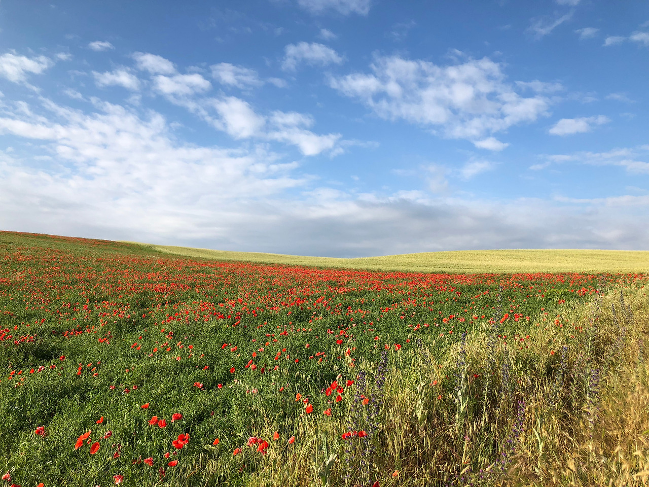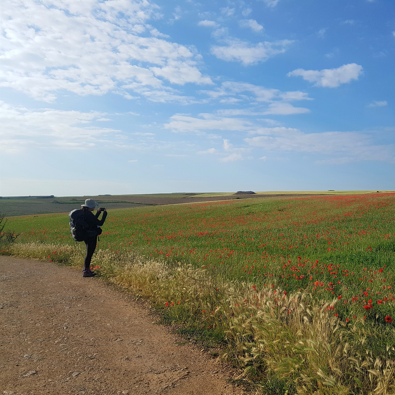 숙소에서 봤던 한국 남자를 다시 만나게 됐다. 자전거를 타고 우리를 불러 세운 그는 이맘때쯤 이곳 양귀비 밭이 그렇게 아름답다고 했다. 지금은 밭을 갈아서 예전에 비해 크기가 작아졌다며 아쉬워했다. 서울에서 사진전도 했었다는 그는 네이버 순례자 카페에 올릴 자신의 사진을 보러 오라고 했다. 어쩌면 올해도 스페인 어딘 가에서 사진을 찍고 계실지도 모르겠다.