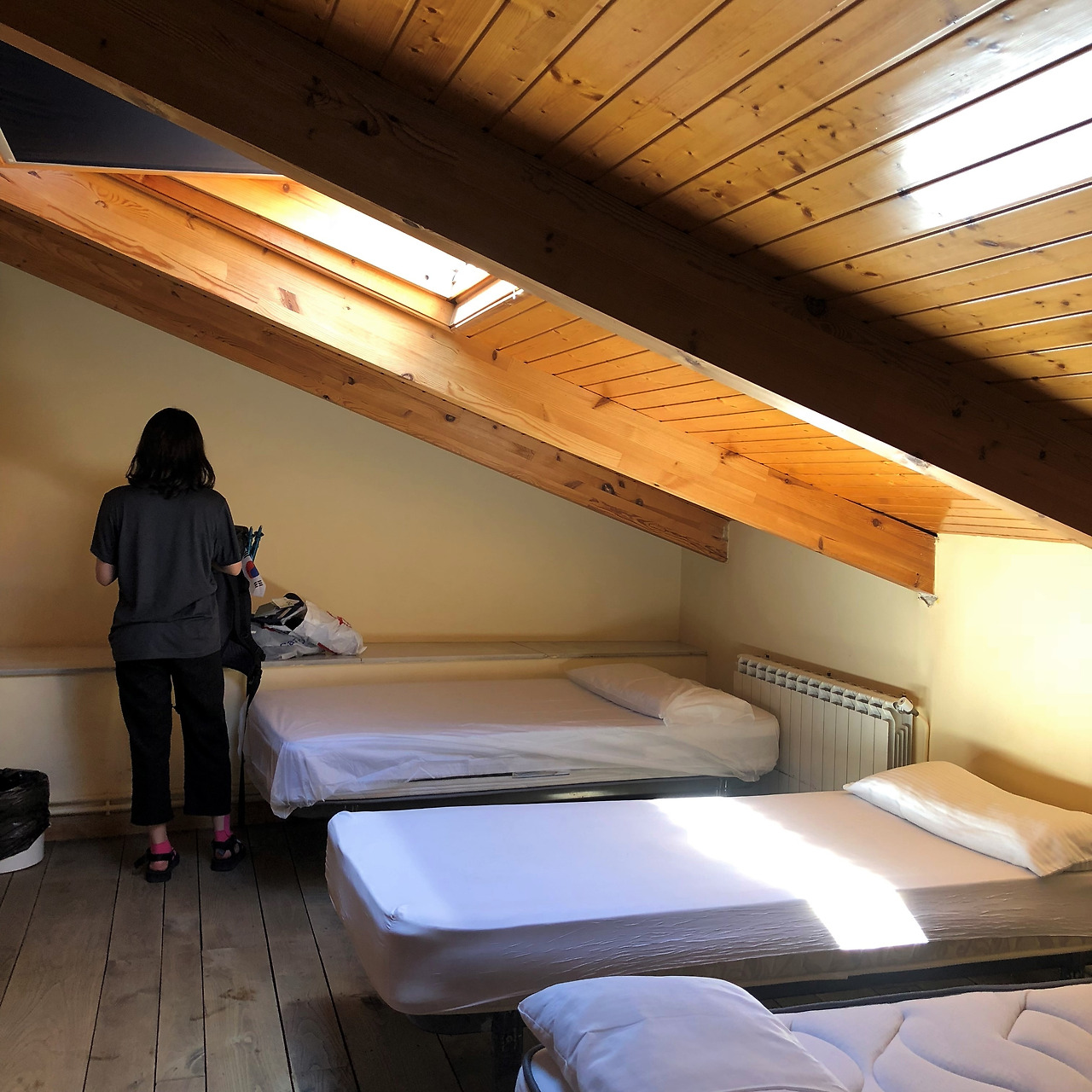 오후 세시. 가파른 언덕길을 쥐어짜듯 오르고 나서야 알베르게에 도착할 수 있었다. 오늘 묵을 숙소는 공립 알베르게로 성당에서 운영하는 곳이다. 이곳에선 신부님이 직접 체크인을 도와주신다. 신부님 잘생기셨다 ;)