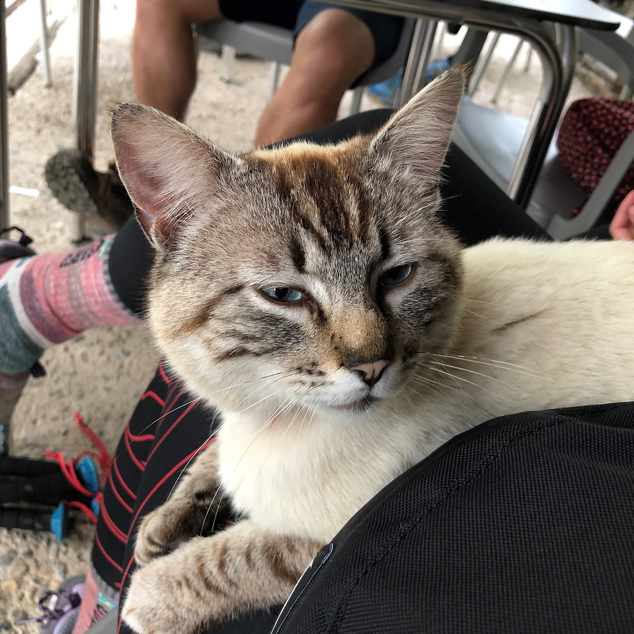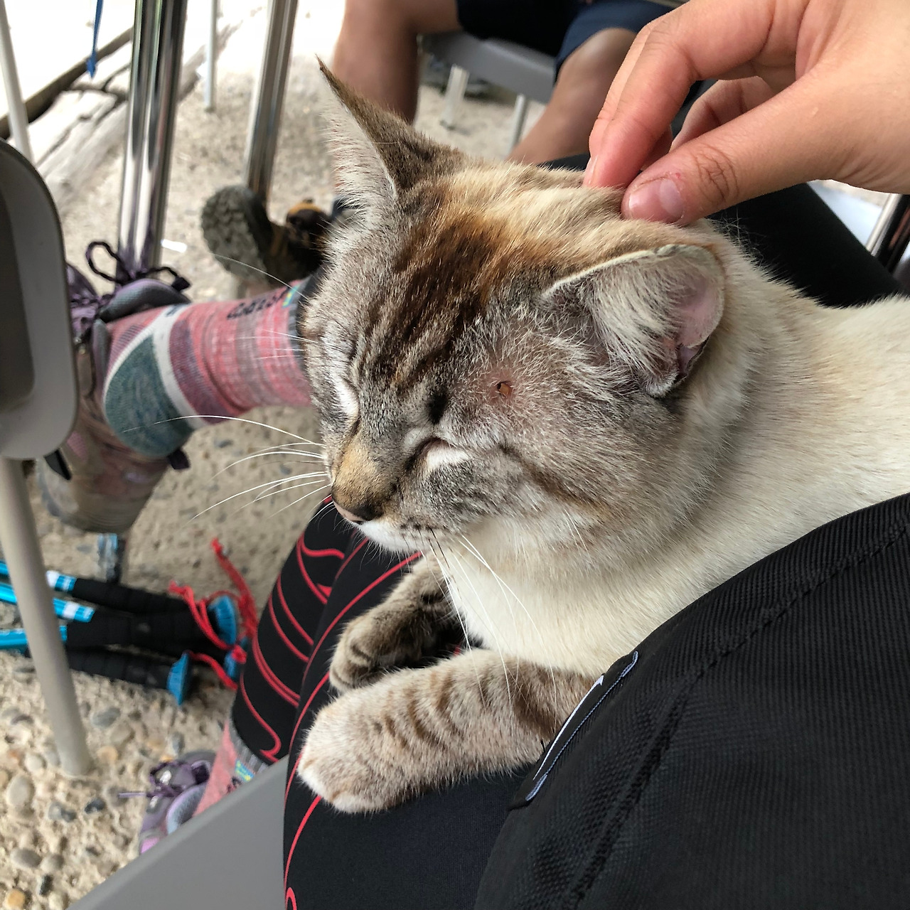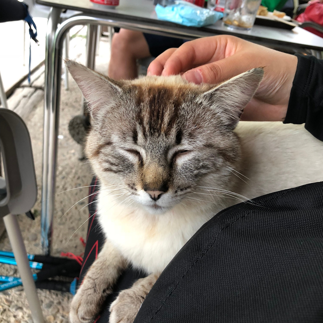 마당을 뛰어다니던 고양이 한 마리가 테이블 근처로 왔다. 어슬렁어슬렁 우리를 살피던 고양이는 단번에 지영이 무릎으로 올라갔다. 지영이게 귀여움 받던 고양이는 이내 내 무릎으로 넘어왔다. 나는 고양이를 만져본 적이 없었다. 내 몸에 올려본 적도 없다. 그걸 알리 없는 고양이는 내 허벅지 위에 자리를 잡더니 하품을 쩍 했다. 허벅지를 누르는 털 뭉치 같은 두 발에 힘이 꽤 들어가 있었다. 어찌할 줄 몰라서 당황했지만 어디서 본 건 있어서 아주 조심스럽게 머리를 쓰다듬었다. 내 손길이 나쁘진 않았는지 눈을 감고 편안해하는 것 같았다. 내 허벅지는 금세 뜨끈뜨끈해졌다.