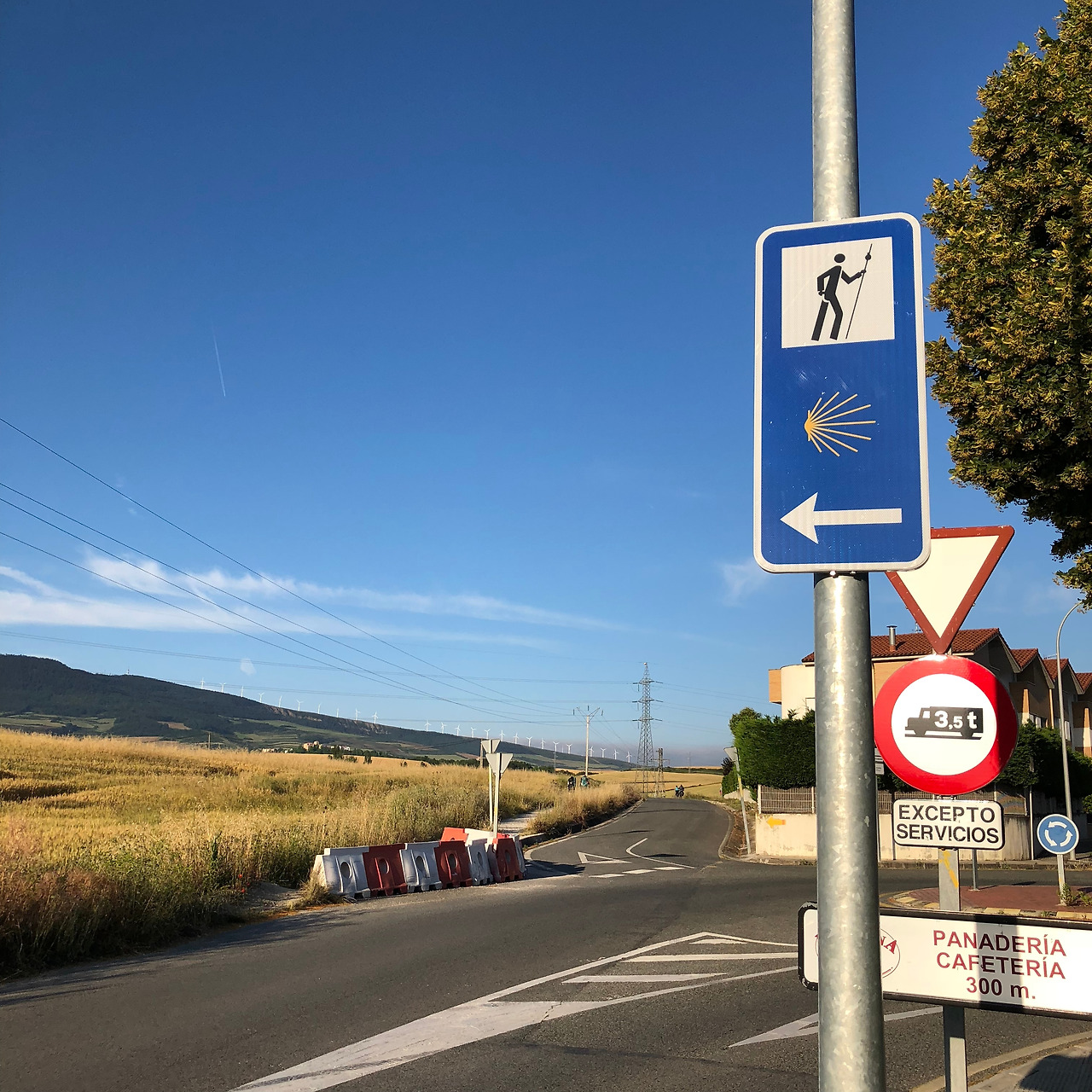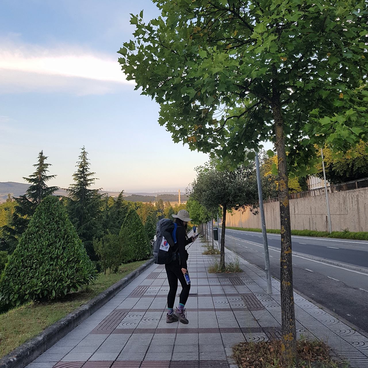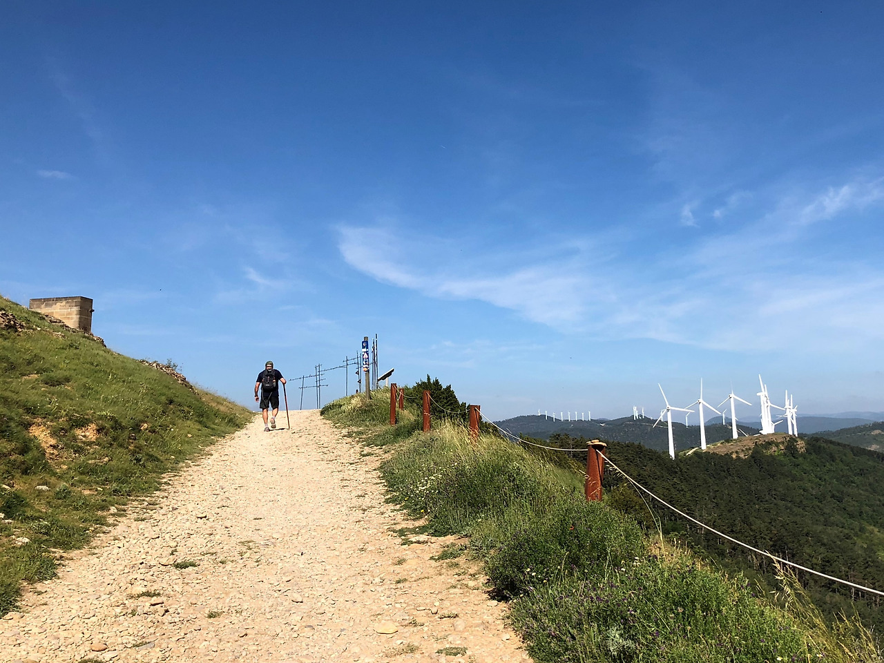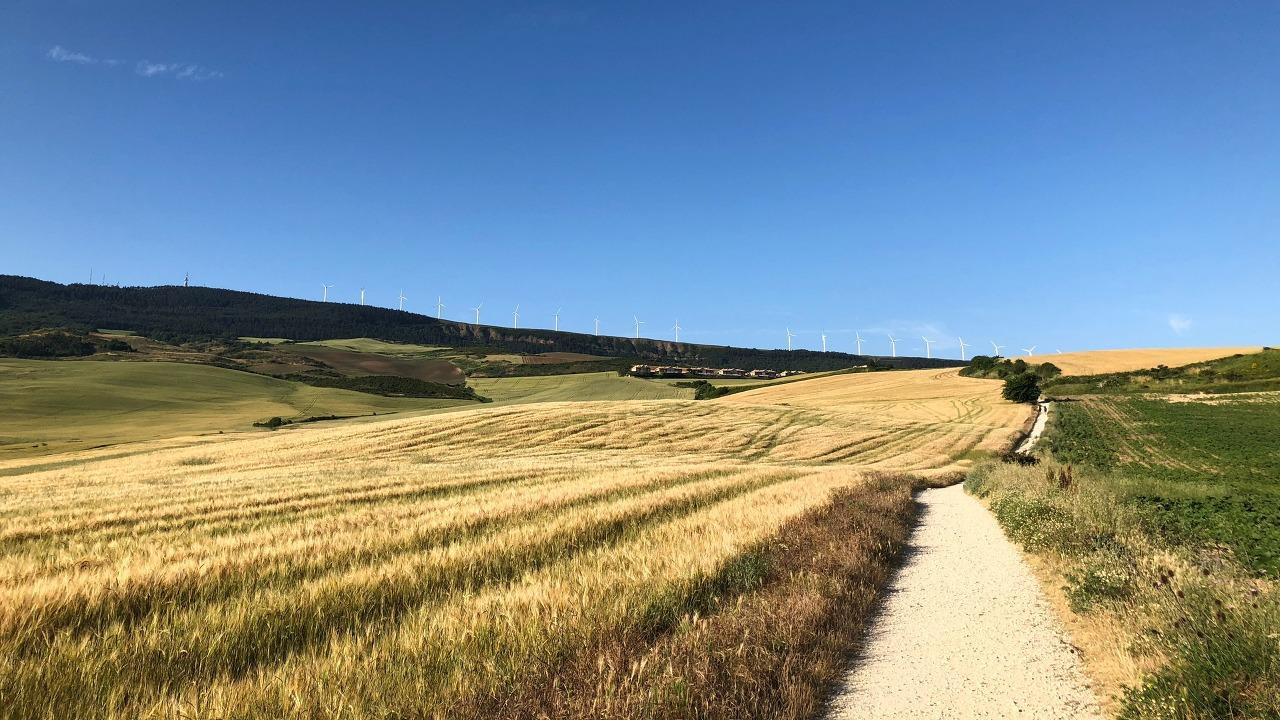 사진을 보면 저 멀리 산등성이를 따라 흰색의 기둥들이 세워져 있는 걸 볼 수 있다. 팜플로나를 벗어날 때부터 보였던 이것은 풍차다. 요한 오빠 말로는 오늘 보게 될 용서의 언덕이 저 풍차가 있는 산을 올라야 나온다고 했다. 아깐 정말 까마득했는데 40분 정도 걸었다고 꽤 가까워진 것 같다.