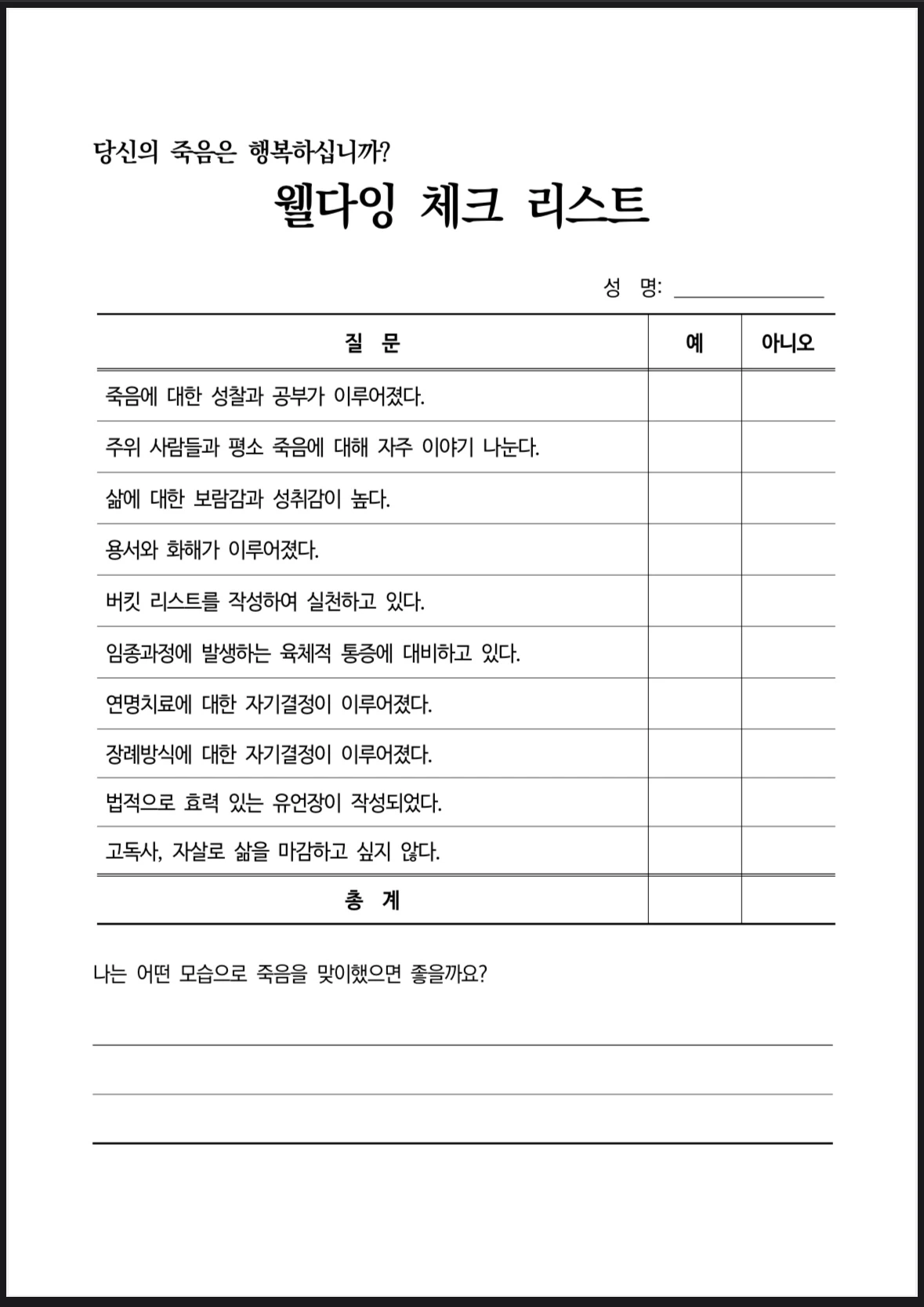 오늘 교육원에서 해본 그 웰다잉 체크리스트를