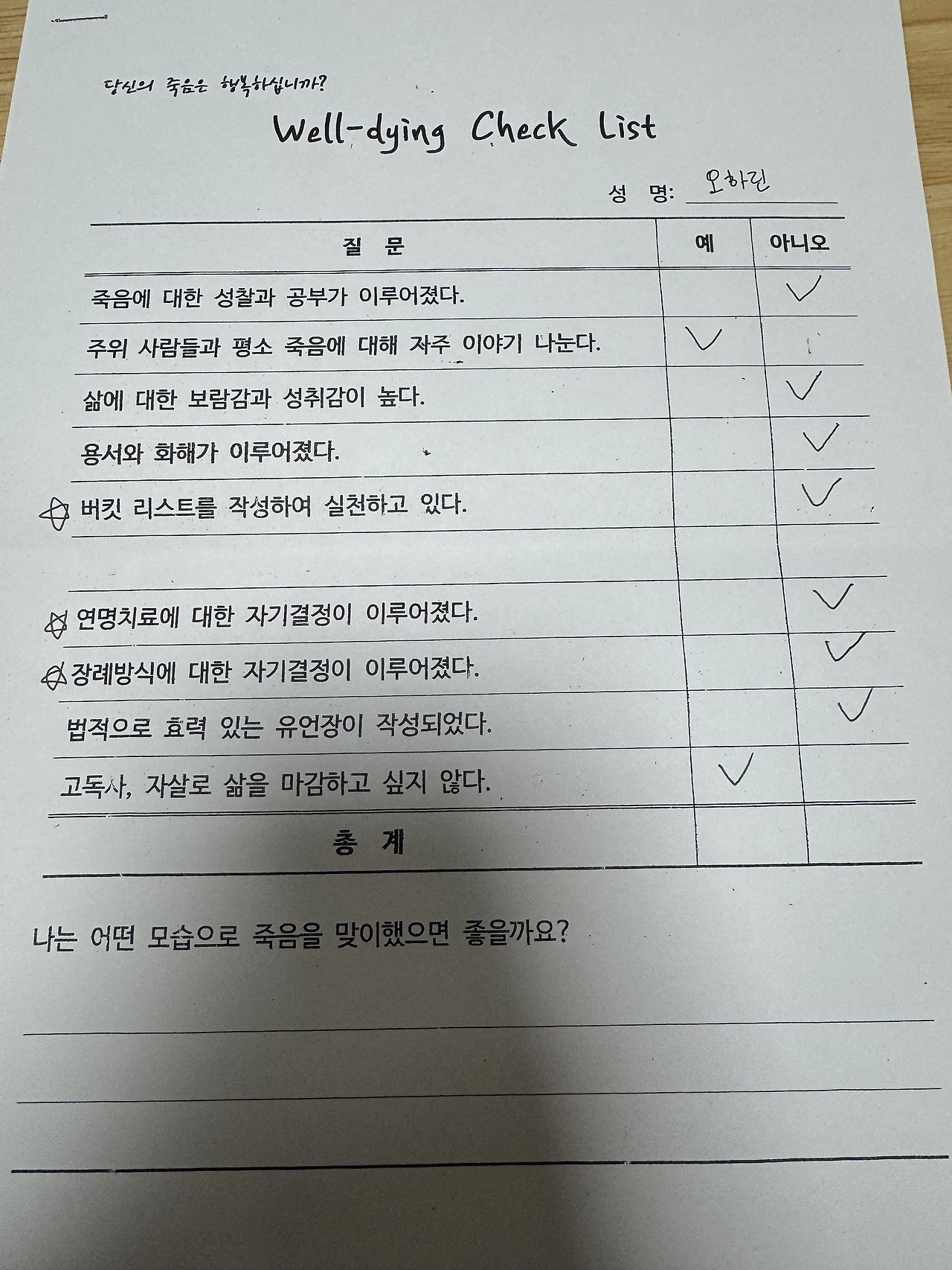 오늘 교육원에서 웰다잉 체크리스트를 했다.