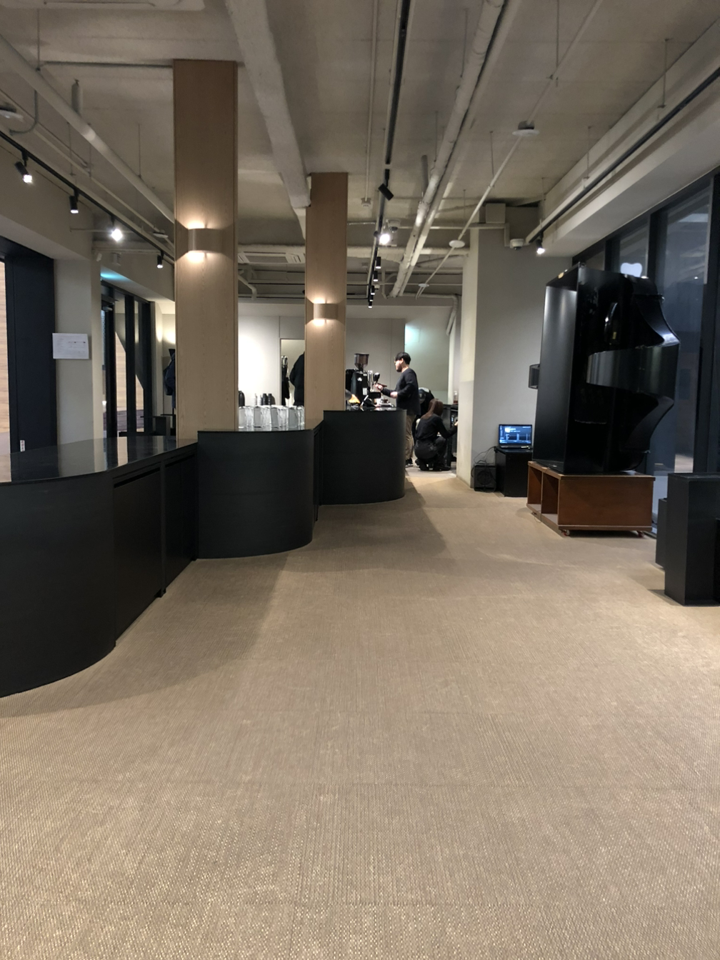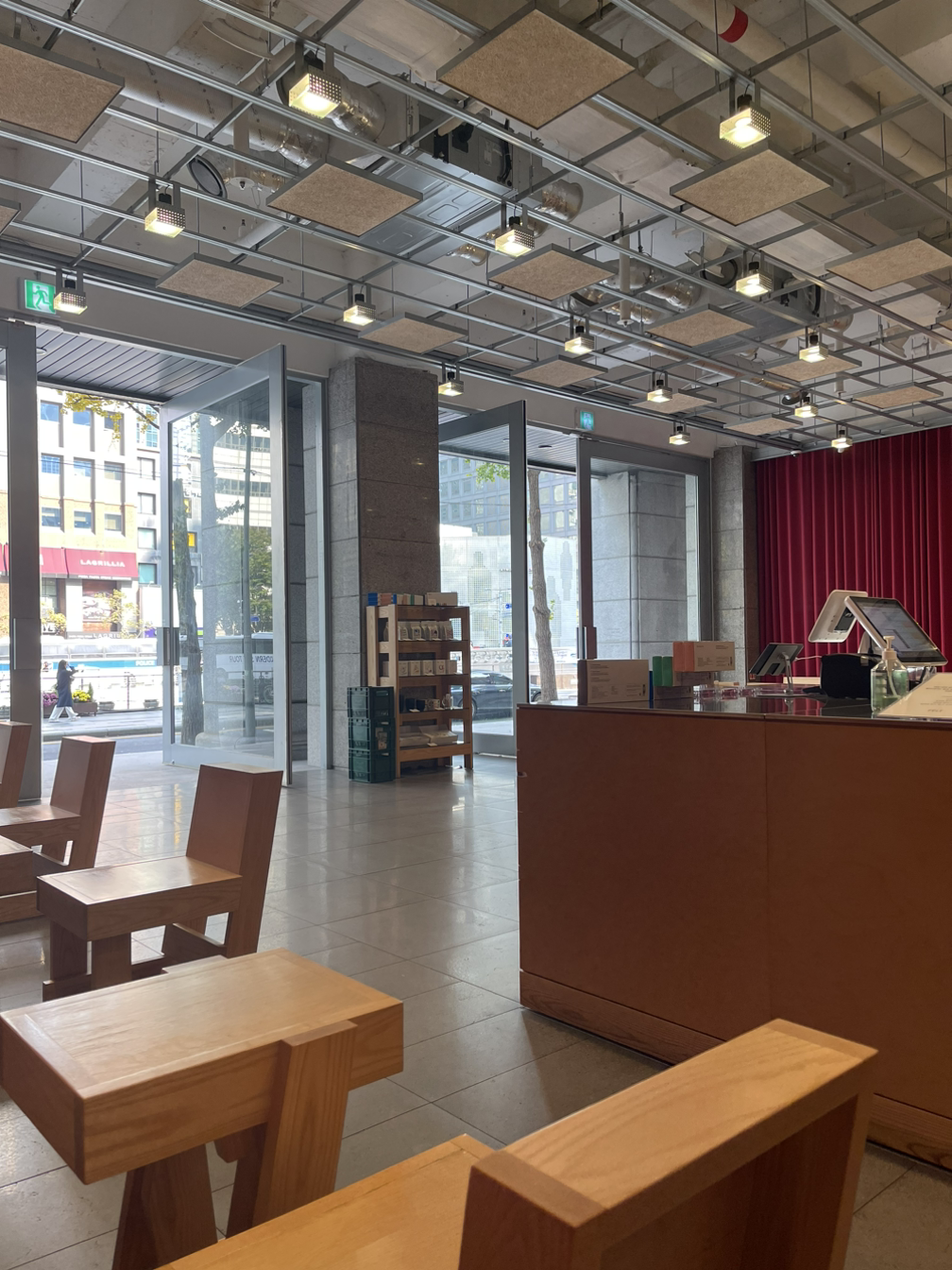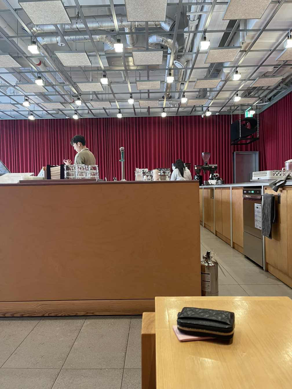 광화문점에서 가까운, 청계천점은 또 새로운 분위기다. 처음엔 광화문점에서 멀지 않고, 앞에는 다른 스페셜티커피 전문점이 보이는 왜 이곳을 선택했을까? 의문이 들었다. 송대웅대표 인터뷰에 의하면, 청계천점은 어릴 적 자주 다니던 길이라 친숙해서 결정했다고 한다. 나에겐 맞은편에 위치한 미국 스페셜티커피 전문점에 자신감을 보여주는 다짐으로 느껴졌다. 청계천점의 벽은 마치 피아노건반덮개를 떠오르는 진한 붉은색 천이 둘러싸고 있다. 참으로 이전 두 곳의 펠트매장과 다른 분위기지만, 어째서인지 아 펠트매장이구나 하는 통일감이 느껴진다. 이곳 역시 창전동 쇼룸의 신념을 따른다. 다른 지점보다 테이블은 많지만 가운데에서 가장 큰 면적을 차지하는 것은 커피바이다. 커피가 만들어가지는 과정이 중심이 되는 매장. 역시 펠트를 관통하는 개념이다.