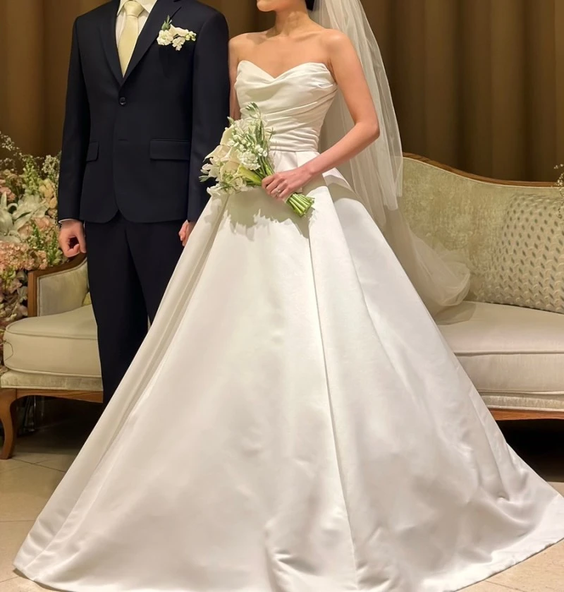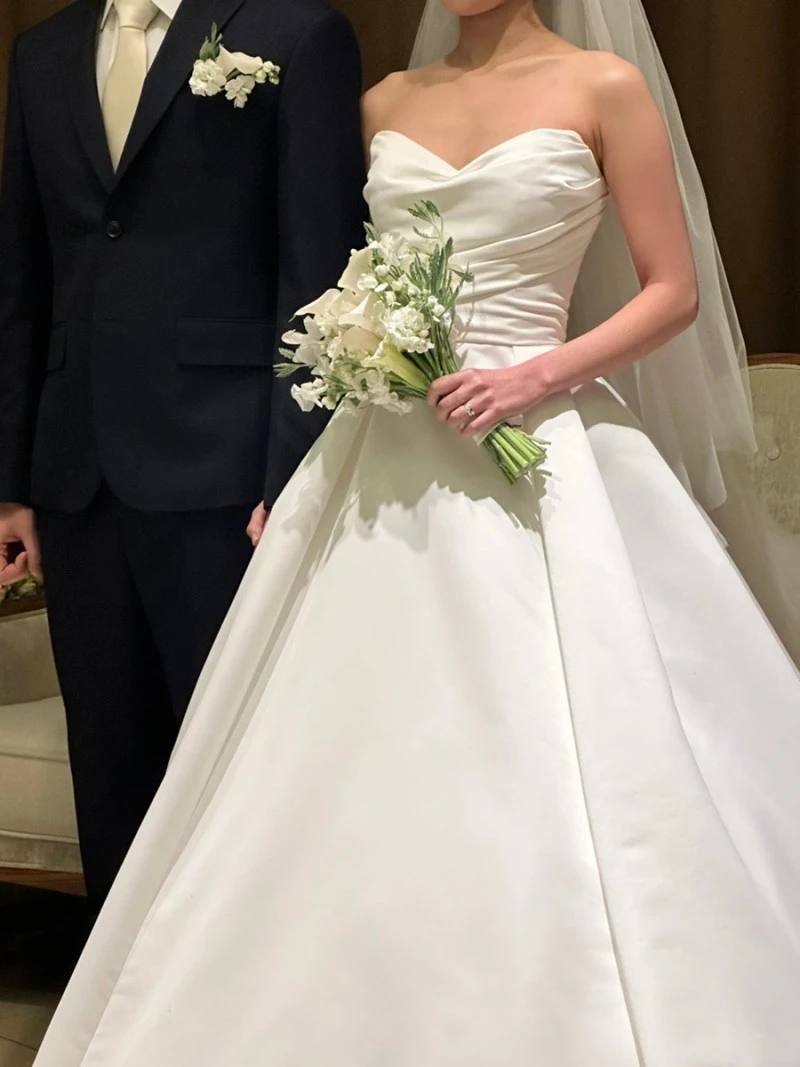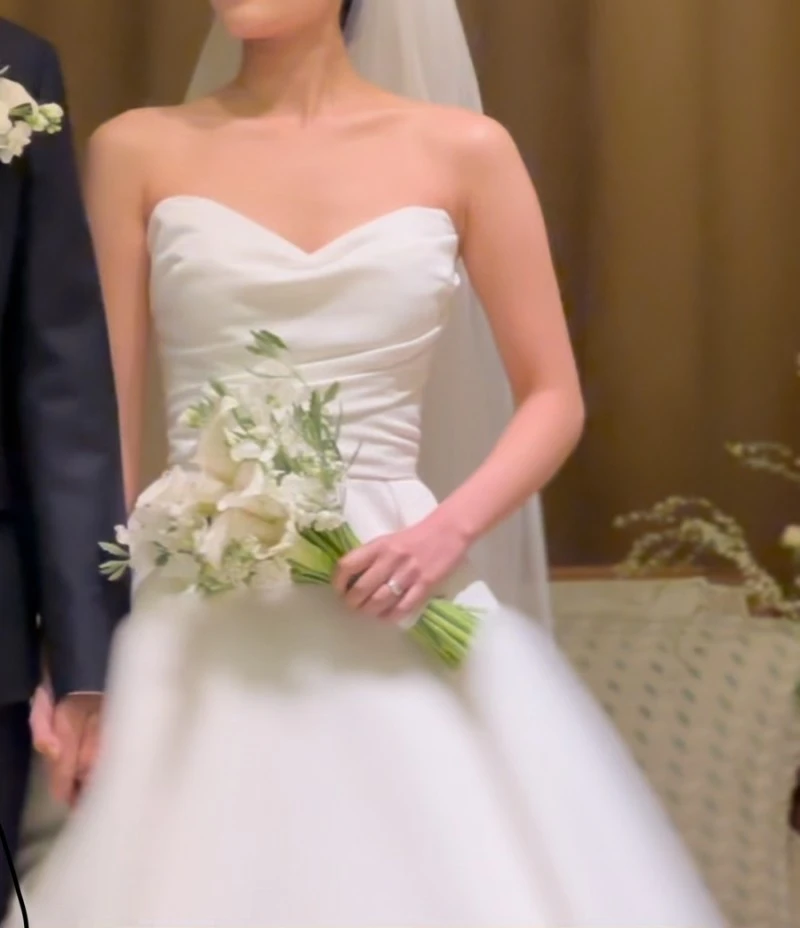 2. 유행타지 않는 순백 미카도실크 오프숄더 드레스를 선택했다. 여리여리한 오간자실크 보다는 힘있고 고급스러운 미카도실크, 오프숄더 드레스는 디테일이 많이 안들어간 심플한 하트넥 디자인이다. 사실 이 드레스 사진을 처음 보고 반해서 이 드레스 샵을 선택하기도했다