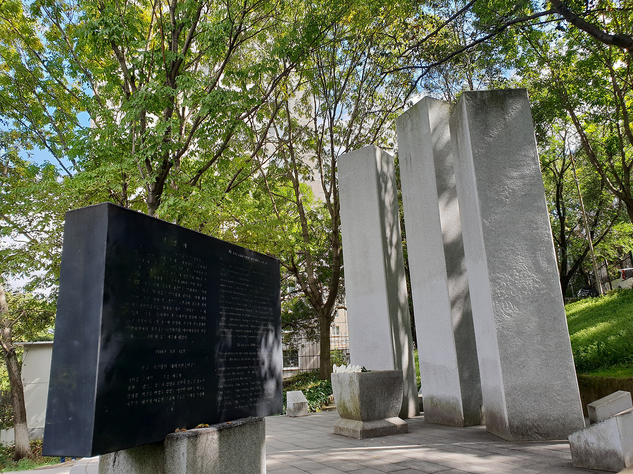 포크롭스키 성당을 지나면서 블라디보스토크 중심가에서는 꽤 멀어져 있었다. 그 성당을 기점으로 위쪽으로 오를수록 여행자들은 눈에 띄게 줄었고, 구글 지도가 알려주는 방향을 따라 큰길을 벗어나니 결국엔 러시아인들 밖에 남지 않았다. 그도 그럴 것이 나는 현지인이 아니고서야 크게 방문할 이유가 없어 보이는 한 빌라단지에 들어서있었다. 어딘가에 한국의 역사적인 기념비가 있으리라고는 생각되지 않는 분위기였다. 주민들 또한 배낭을 메고 두리번거리는 한국인을 한 번씩 쳐다보며 지나갔다. 그러다 한 사거리에서 문득 위화감이 느껴지는 곳으로 시선을 돌렸다. 울창한 나무들 사이, 바로 여기라는 강한 느낌.