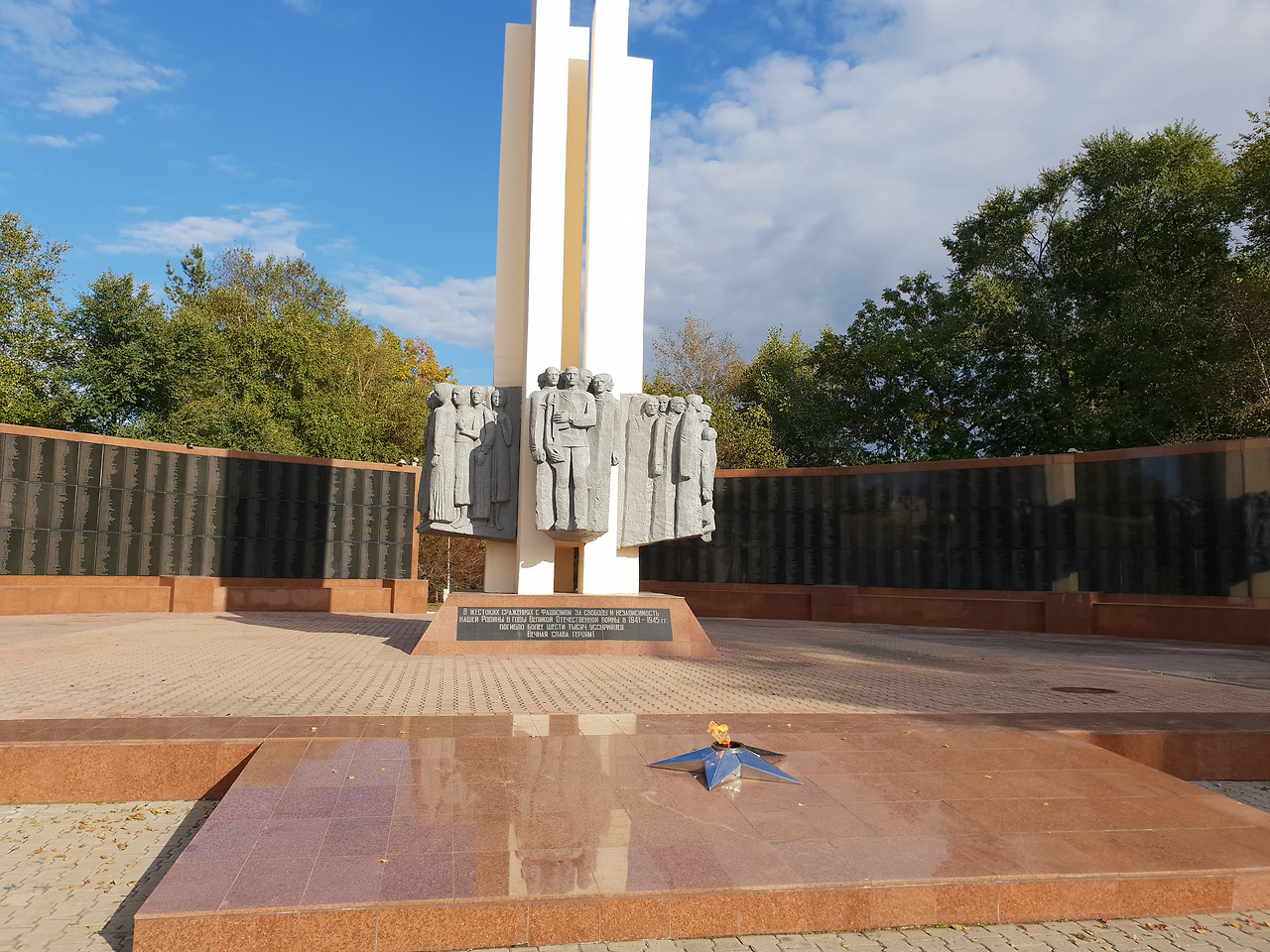 그런데 그 공원을 지나자 예사롭지 않은 분위기의 광장이 또 한 번 나타났다. 블라디보스토크에서 본 적이 있었기에 ‘영원의 불꽃(구글 지도상 명칭은 Vechnyy Ogon다)’임을 즉시 알아볼 수 있었다. 우수리스크에도 영원의 불꽃이 있다는 것은 알고 있었지만, 시간의 제약으로 인해 굳이 방문하지 않을 생각이었다. 그런데 이렇게 무작정 걷던 길 위에서 명소를 만나니 또 무척 반가웠다. 기념탑과 동상 아래의 꺼지지 않는 불꽃은 세계대전 참전 용사들을 기리기 위함인데, 우수리스크에서 그것을 보자 왠지 독립운동에 몸 바쳤던 연해주의 고려인들이 먼저 떠올랐다.
