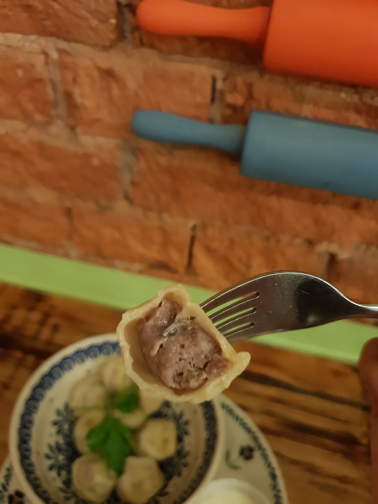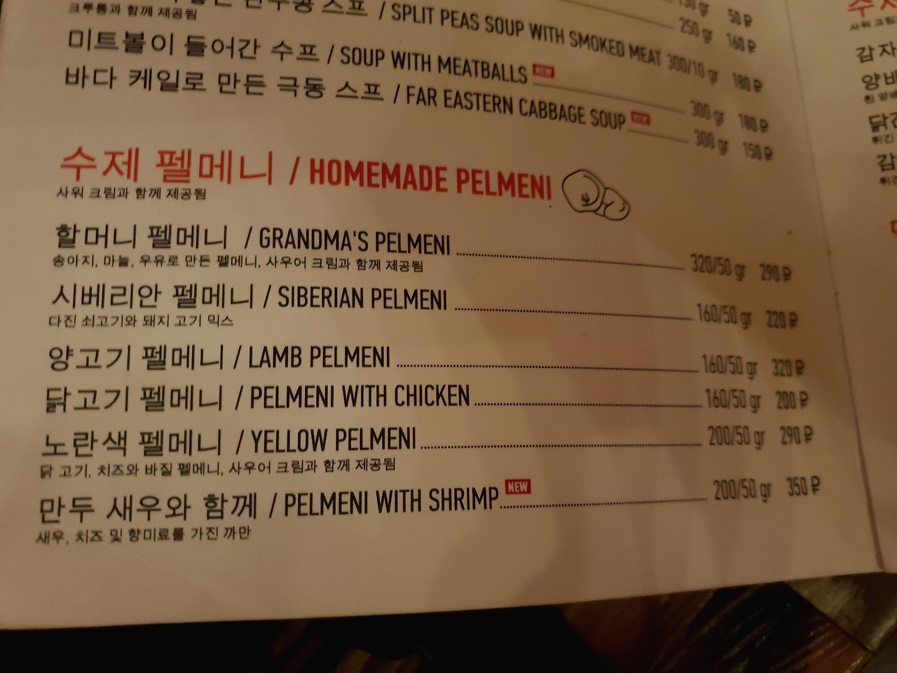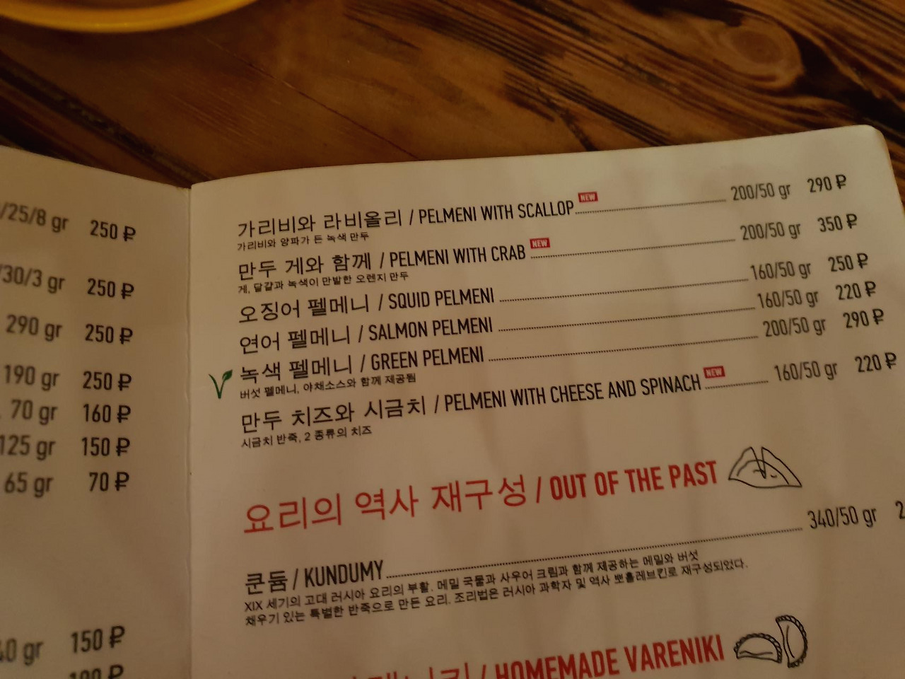 펠메니는 한 입에 쏙 들어올 만큼 크기가 작으며 밀가루 피가 얇은 것이 특징이다. 일반적으로 삶는 방식으로 조리되는 만두인데, 지역에 따라 여러 육수나 수프에 데우거나 혹은 튀겨먹는 경우도 있다고 한다. 우리에게 익숙한 만두와 마찬가지로 러시아 전통 펠메니는 만두소로 다진 고기가 들어가지만 오늘날의 펠메니는 속을 어떤 재료로 채우느냐에 따라 다양한 종류로 나뉜다. 로즈키 플로스키에도 무척 다양한 종류의 펠메니가 있어서 나는 메뉴판 앞에서 깊은 고민에 빠졌다.