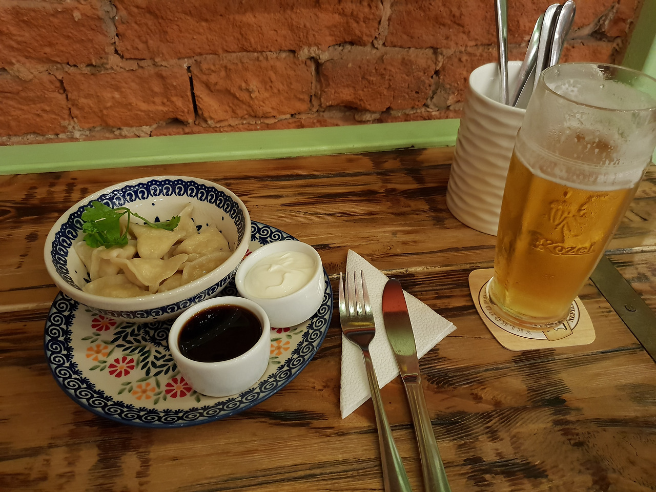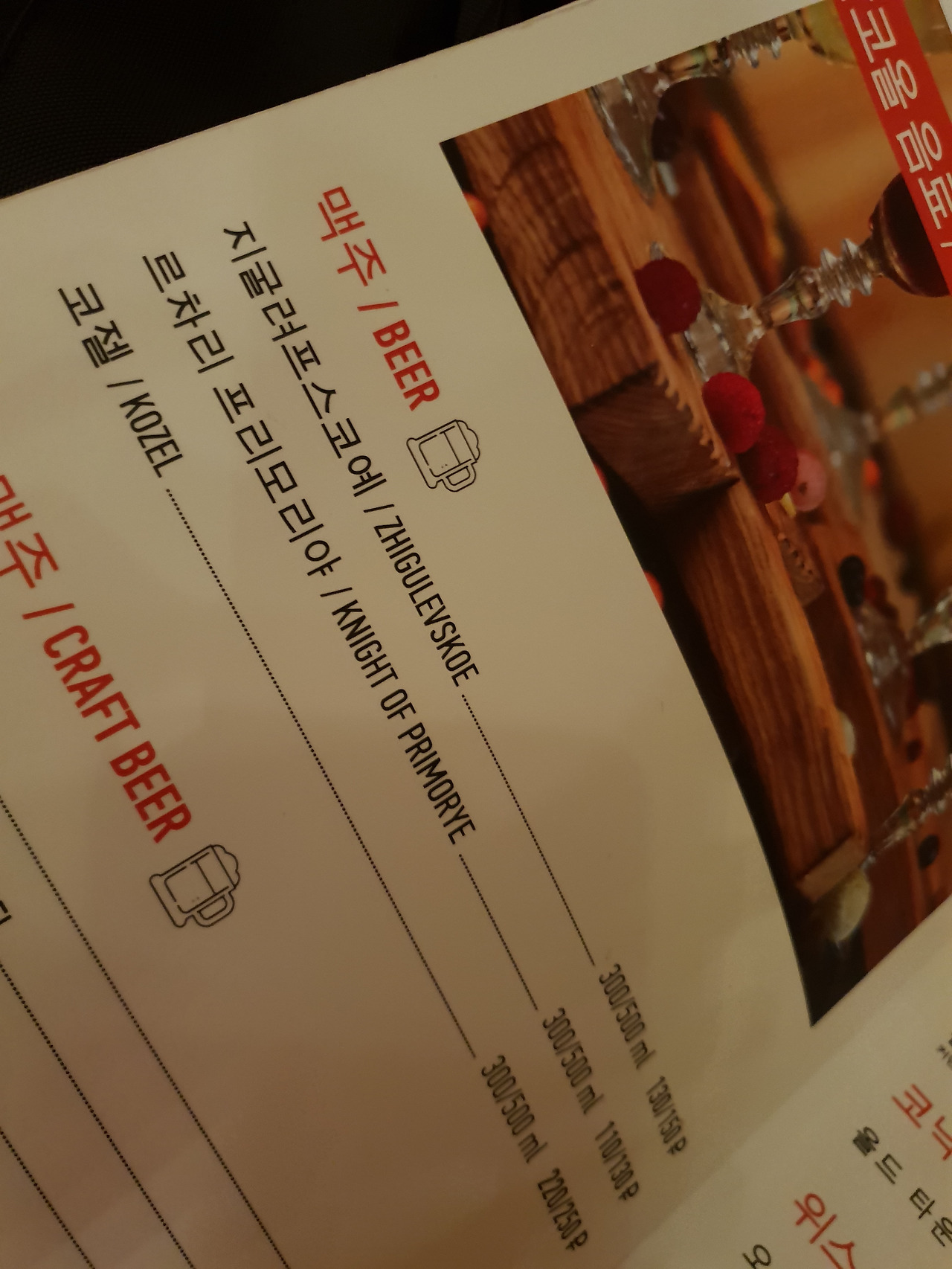 안타깝게도 가장 먼저 고른 ‘새우와 함께(WITH SHRIMP)’는 오늘의 판매량이 매진된 상태였다. 고심 끝에 무난해 보이는 오징어 펠메니와 로컬 느낌이 물씬 풍기는 시베리안 펠메니, 그리고 ‘지굴려프스코예’라는 상당히 낯선 이름의 생맥주를 주문했다. 물론 러시아인 직원에게 지굴려프스코예! 라고 경상도 사투리처럼 말하진 않았다. 여행 중에는 대게 손가락으로 메뉴판을 가리키며 ‘디스 원(this one)’이라고 주문하는 게 어설픈 현지 언어로 말하는 것보다 훨씬 간편하고 정확했다.