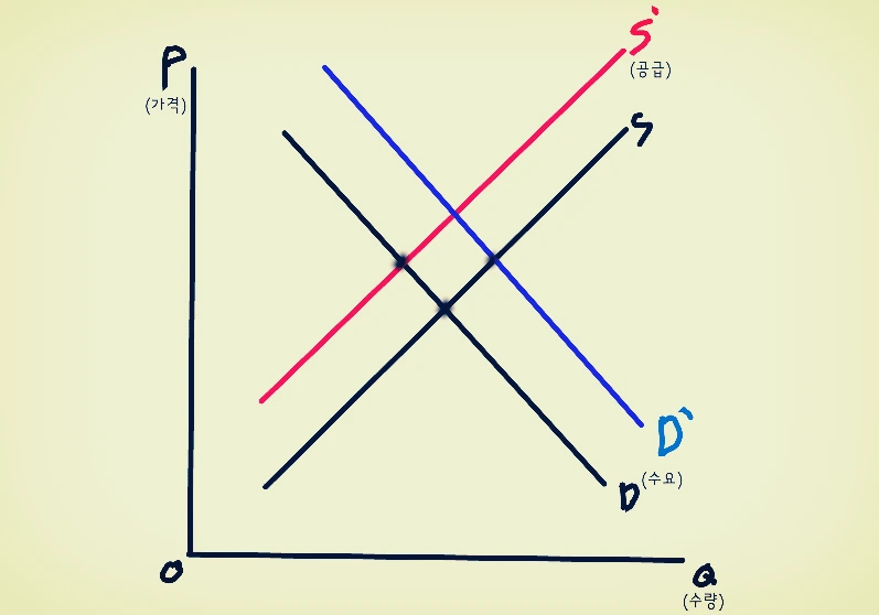 S`선은 기존의 공급 곡선(검은 S선)에 비해 물가가 더 높고 생산량도 더 적다. 생산비용이 올랐으니 더 적게 생산하고, 단가가 오른 만큼 가격을 올리는 것이다. 이는 원자재 인상이 경기에 미치는 영향과 같은데, 한마디로 성장을 위한 정책의 결과로는 최악의 시나리오다.