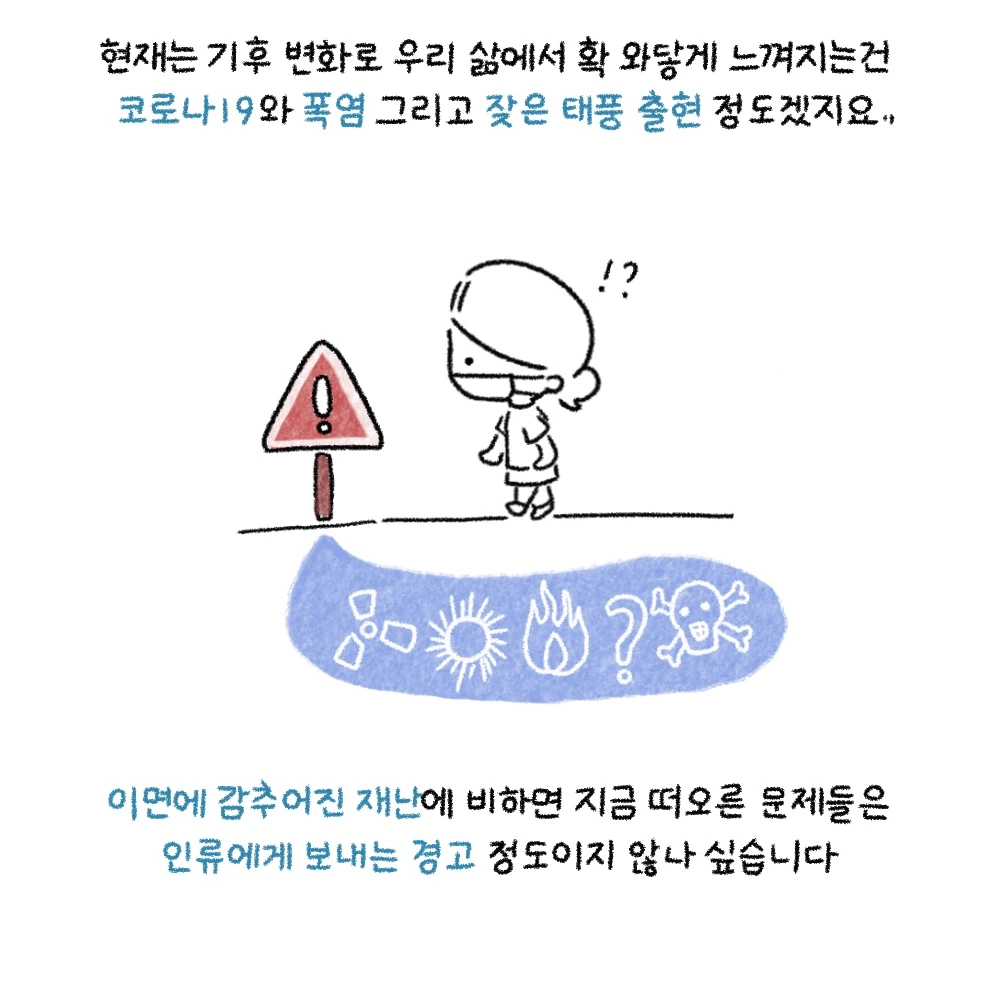 현재 기후 변화로 우리 삶에서 확 와 닿게 느껴지는 건 코로나 19와 폭염 그리고 잦은 태풍 출현 정도겠지요..
