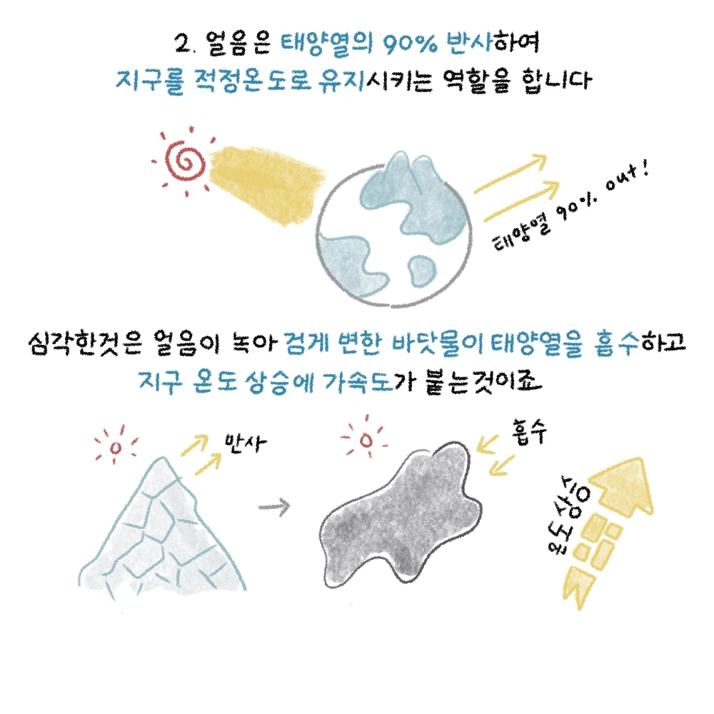 2. 얼음은 태양열의 90%를 반사하여 지구를 적정온도로 유지시키는 역할을 합니다.