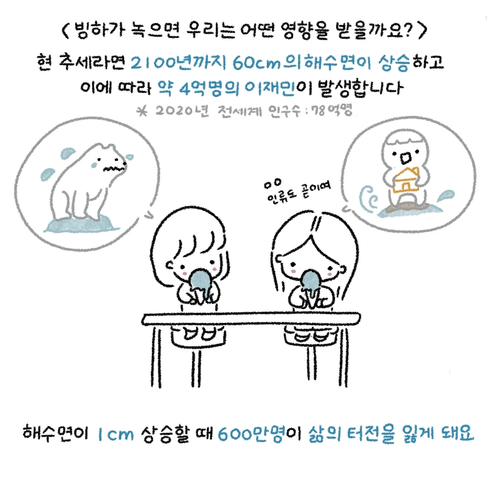 해수면이 1cm 상승할 때 600만 명이 삶의 터전을 잃게 되는 것이지요.