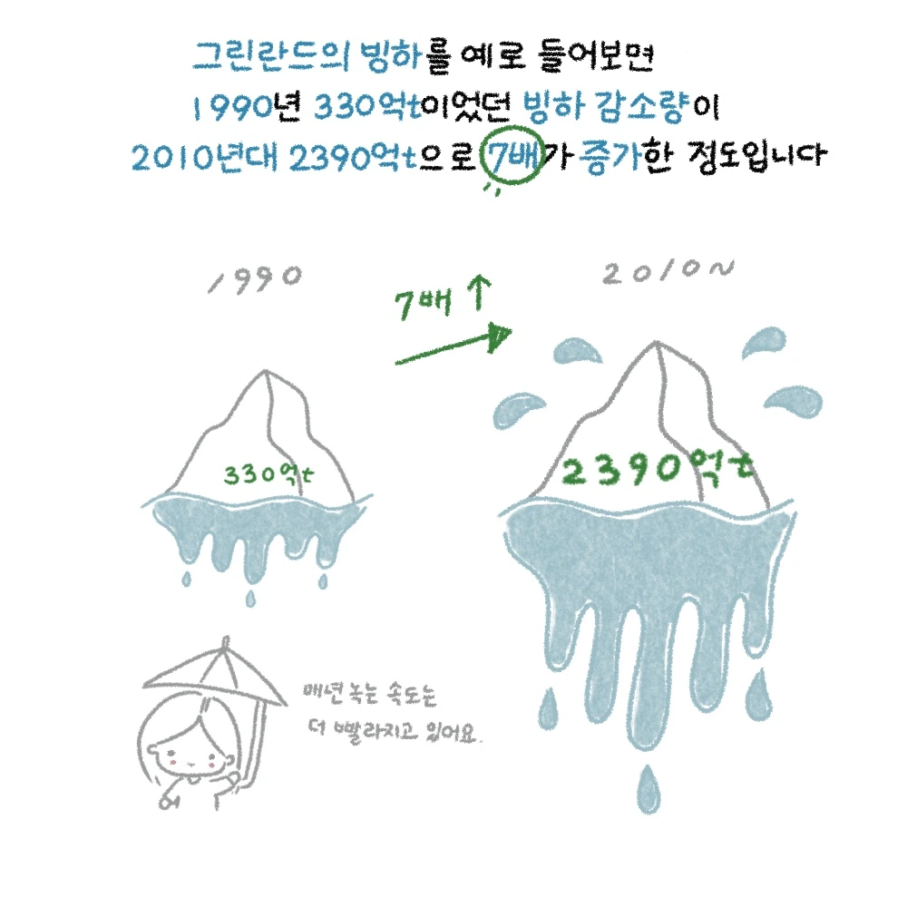 그린란드의 빙하를 예로 들어보면 1990년 330억 t이었던 빙하 감소량이 2010년대 2390억 t으로 7배 증가한 정도입니다.