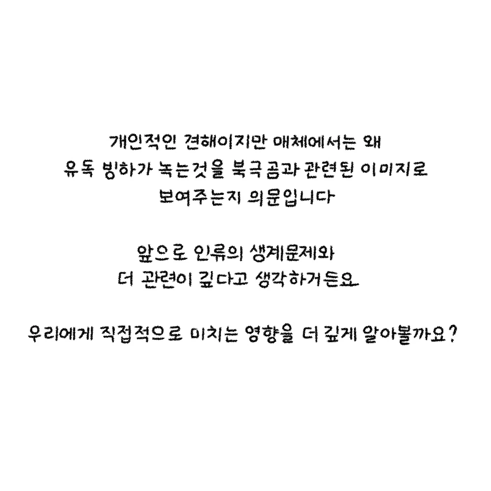 개인적인 견해이지만 매체에서는 왜 유독 빙하가 녹는 것을 북극곰과 관련된 이미지로 보여주는지 의문입니다.