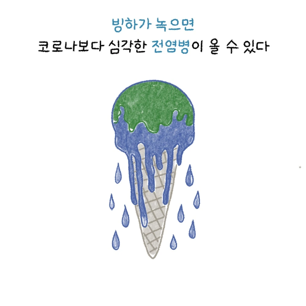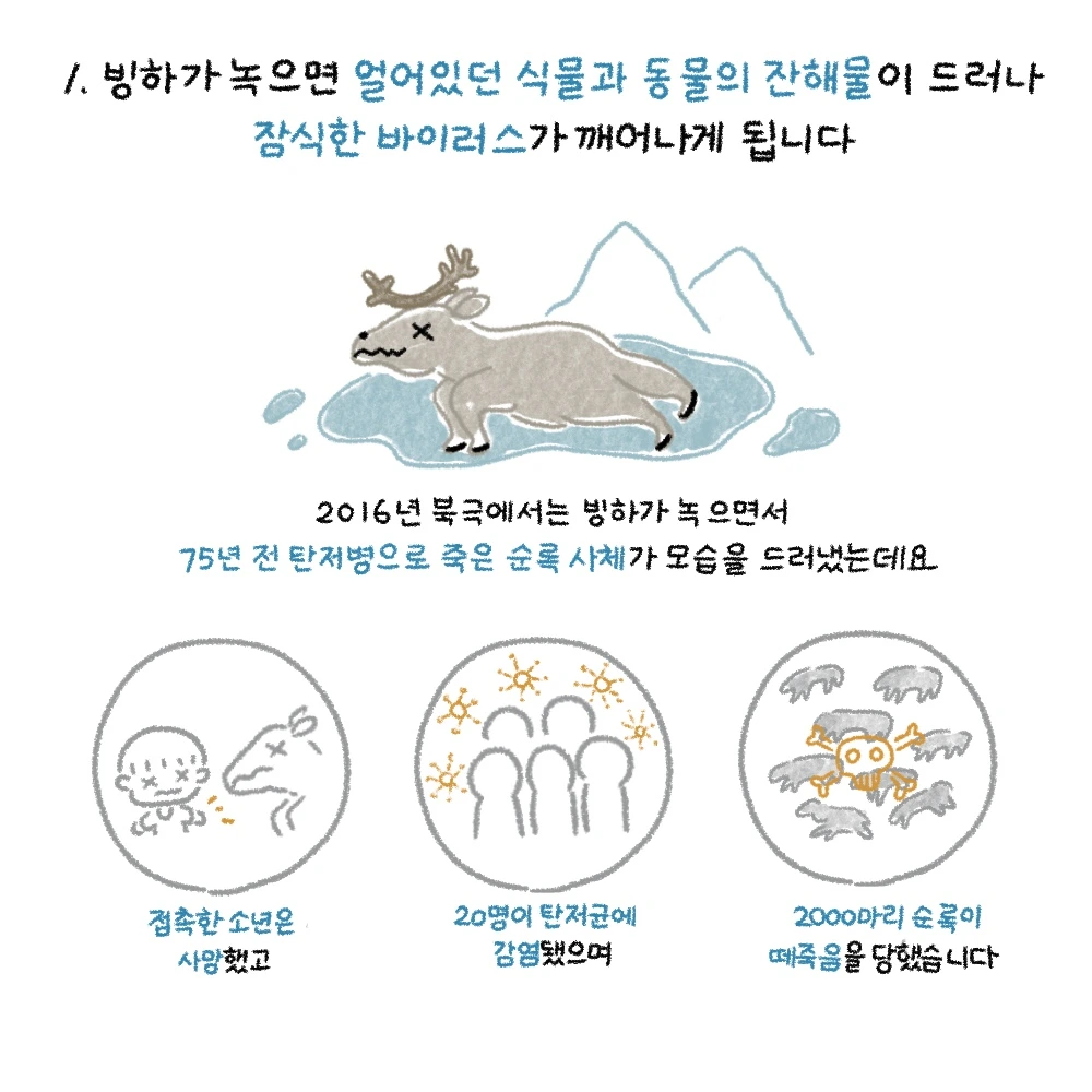 1. 빙하가 녹으면 얼어있던 식물과 동물의 잔해물이 드러나 잠식한 바이러스가 깨어나게 됩니다.