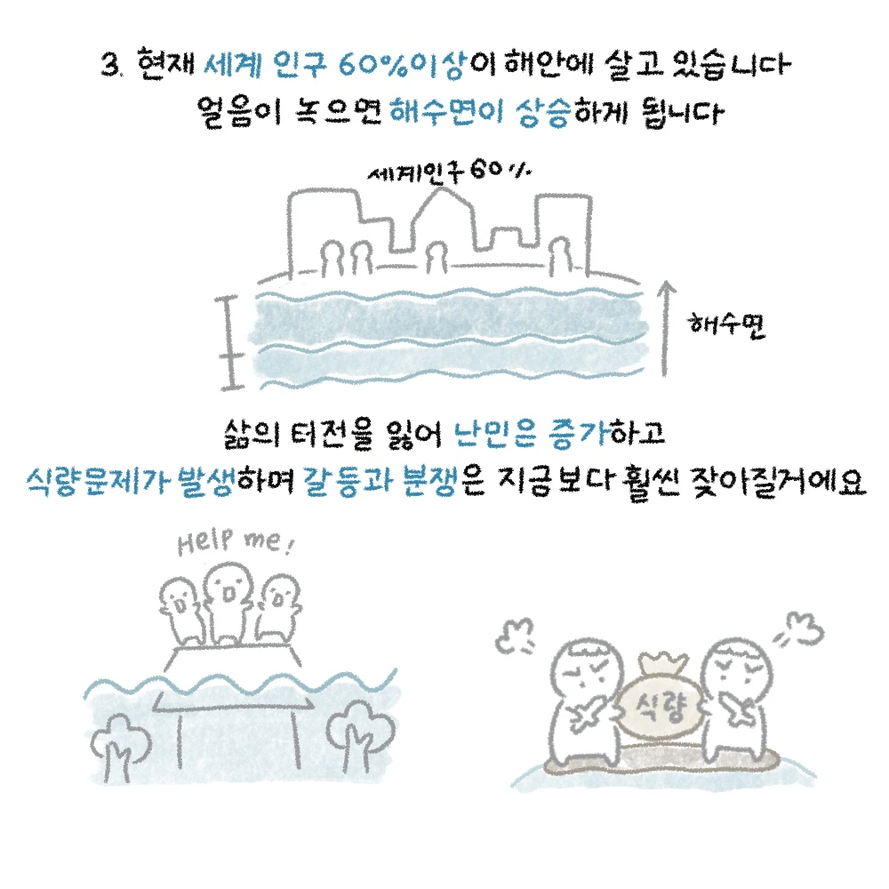 3. 현재 세계 인구 60% 이상이 해안에 살고 있습니다. 얼음이 녹으면 해수면이 상승하게 되는데요.