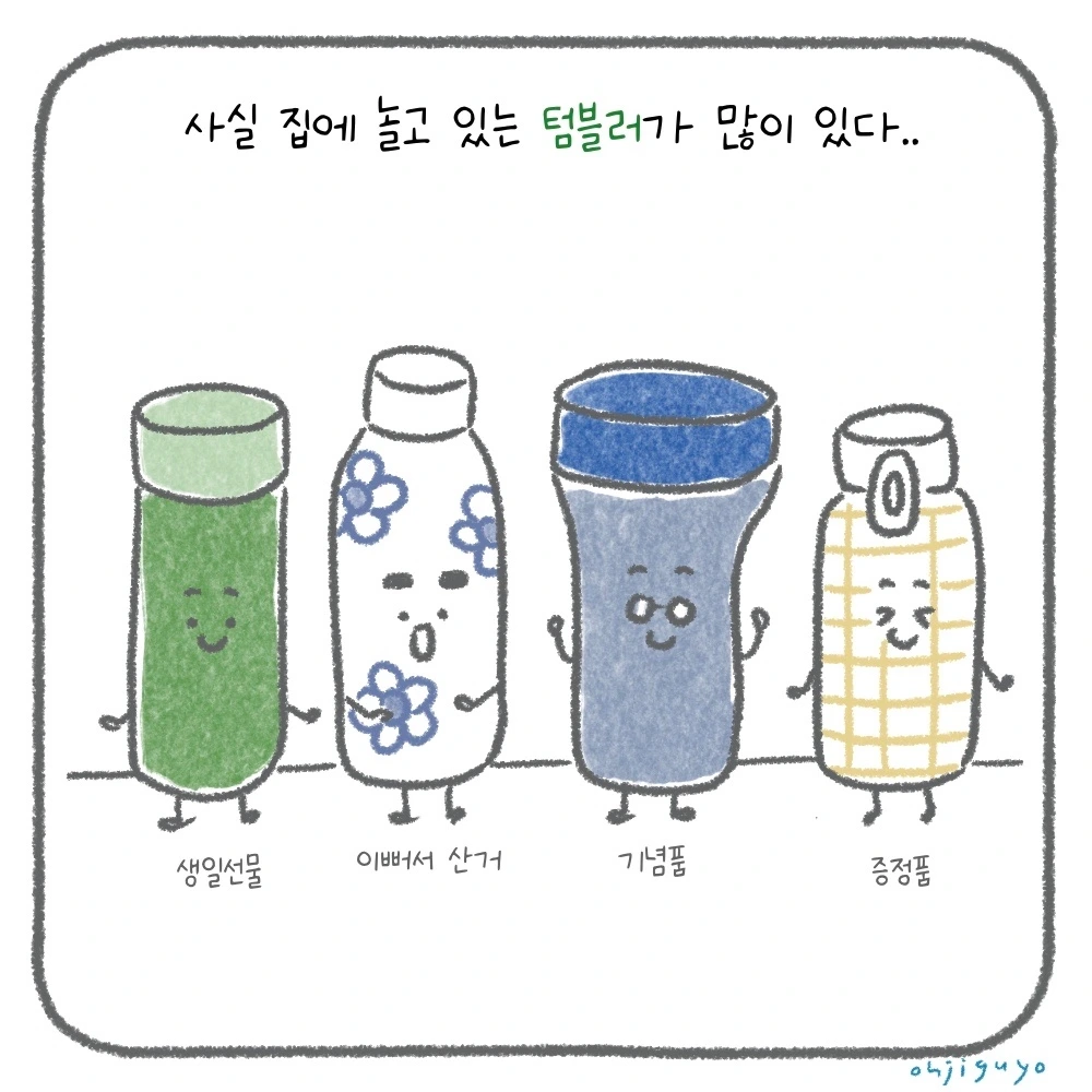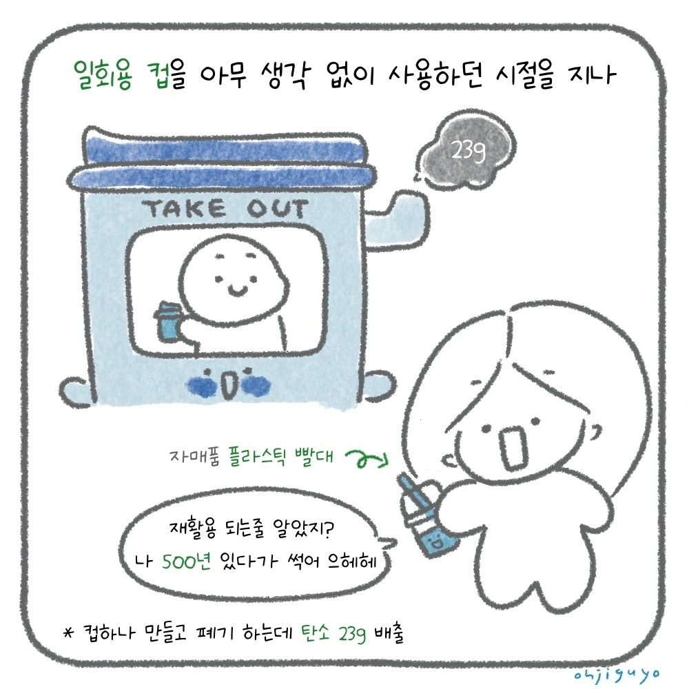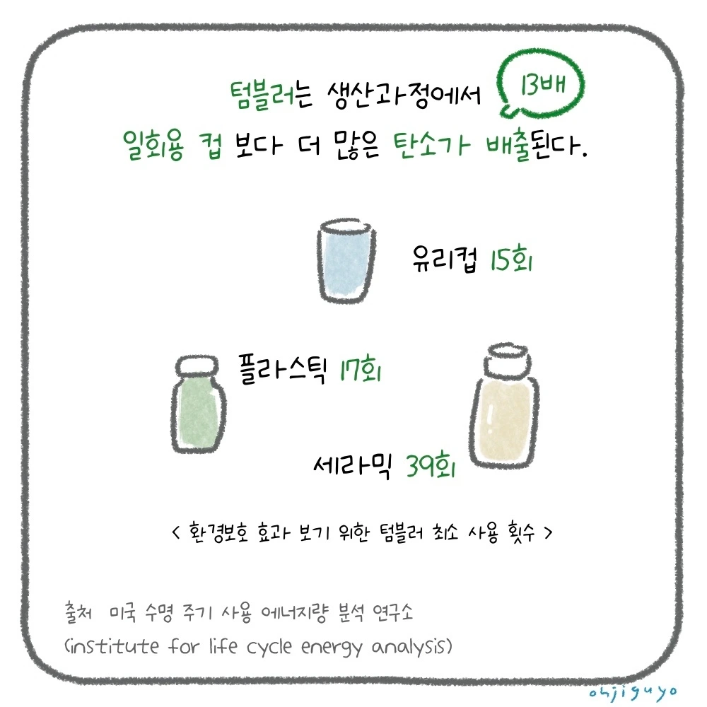 일회용 컵을 아무 생각 없이 사용하던 시절을 지나 요새는 되도록 일회용품을 쓰지 않으려 하고 테이크아웃을 해야 할 땐 텀블러를 쓰곤 한다. 사실 집에 놀고 있는 텀블러가 많이 있다.. 텀블러는 생산과정에서 일회용 컵 보다 13배 더 많은 탄소가 배출된다. 그러니 새로운 것을 자주 사기보다는 튼튼한 텀블러 하나를 오래 사용하는 것이 현명한 방법인 것 같다.