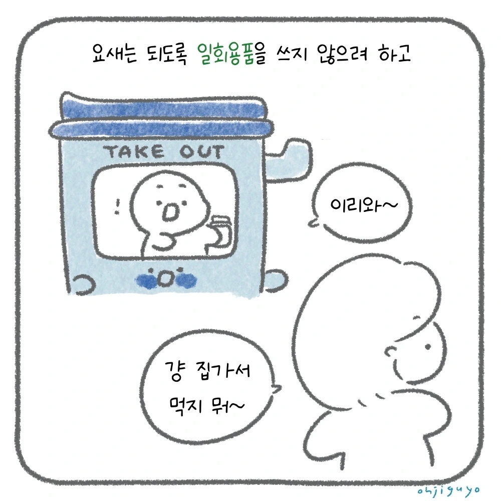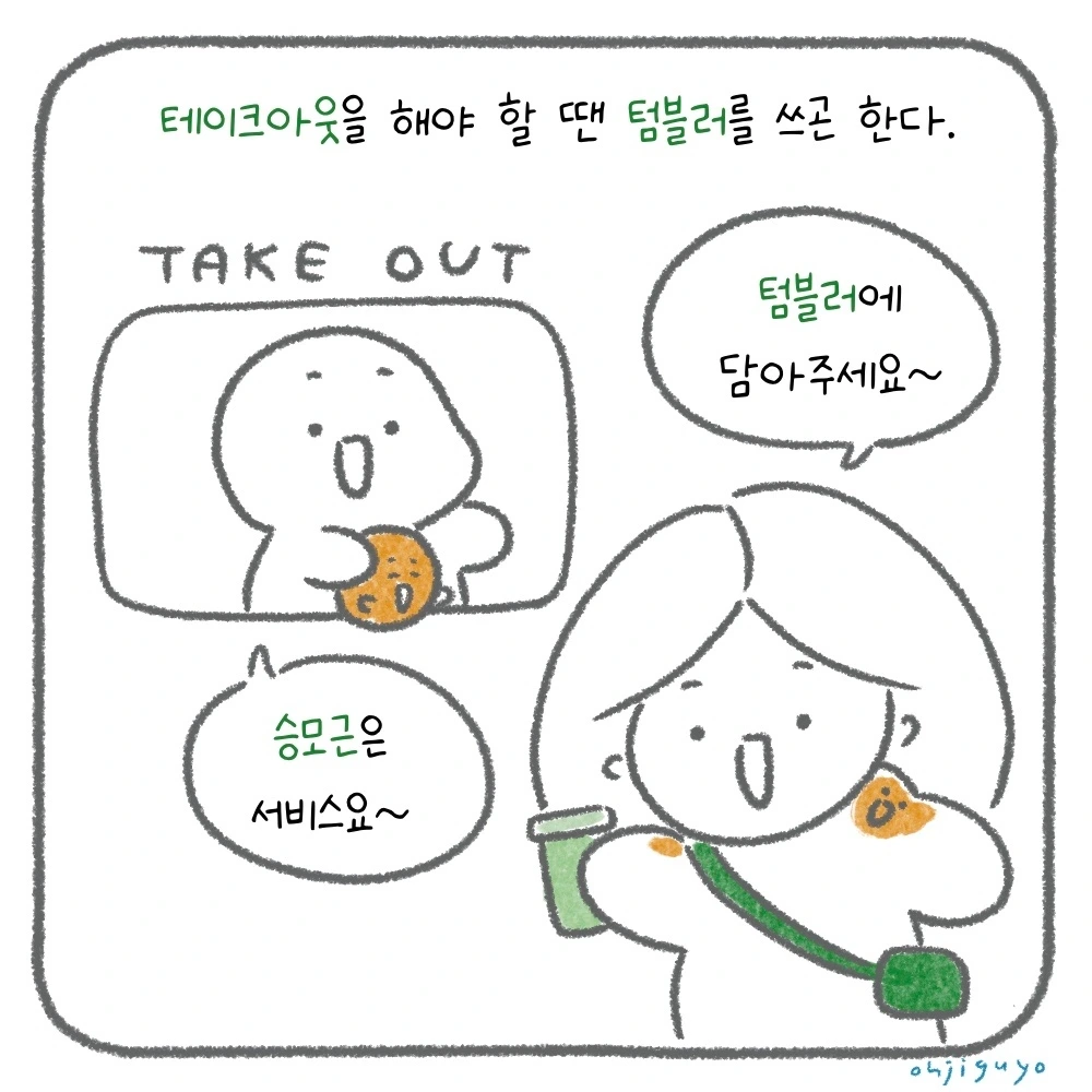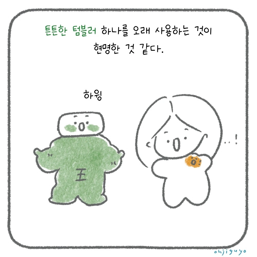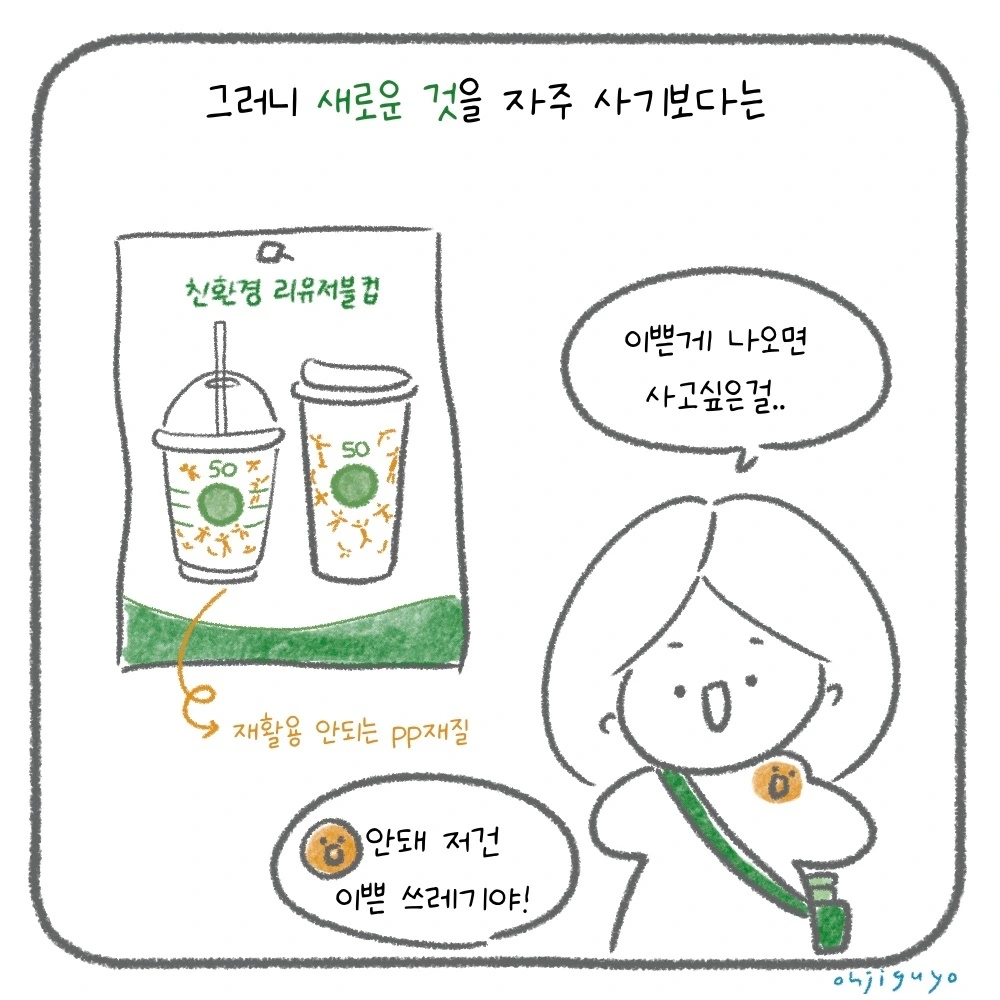 일회용 컵을 아무 생각 없이 사용하던 시절을 지나 요새는 되도록 일회용품을 쓰지 않으려 하고 테이크아웃을 해야 할 땐 텀블러를 쓰곤 한다. 사실 집에 놀고 있는 텀블러가 많이 있다.. 텀블러는 생산과정에서 일회용 컵 보다 13배 더 많은 탄소가 배출된다. 그러니 새로운 것을 자주 사기보다는 튼튼한 텀블러 하나를 오래 사용하는 것이 현명한 방법인 것 같다.
