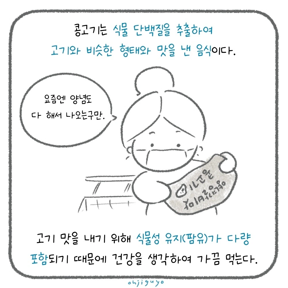 콩고기는 식물 단백질을 추출하여 고기와 비슷한 형태와 맛을 낸 음식이다. 식물성유지가 다량 함유되어 있기 포함되어 있기 때문에 건강을 생각하여 가끔씩만 먹는다.