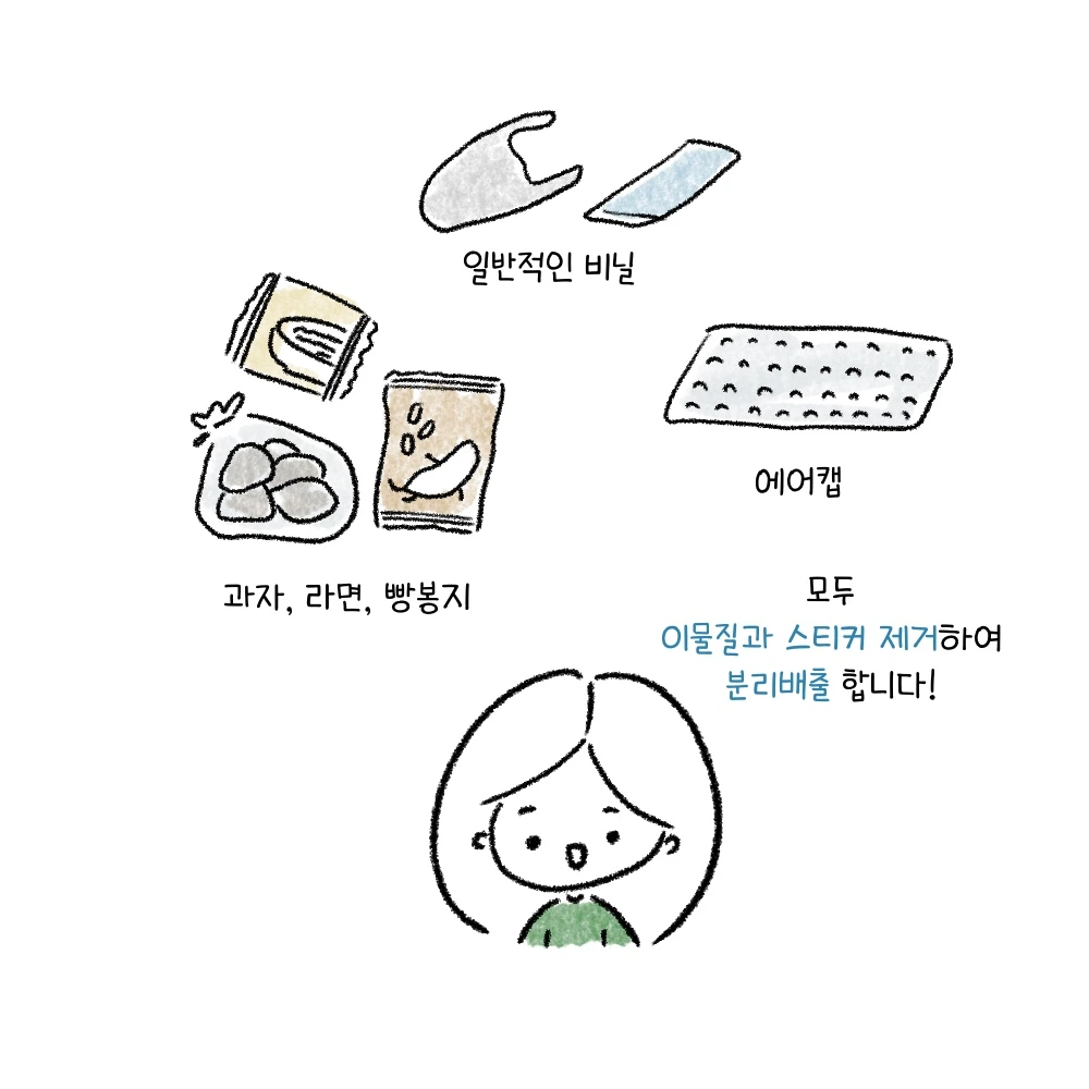 일반적인 비닐, 과자, 라면, 빵 봉지, 에어캡 모두 이물질과 스티커를 제거하여 분리배출합니다.
