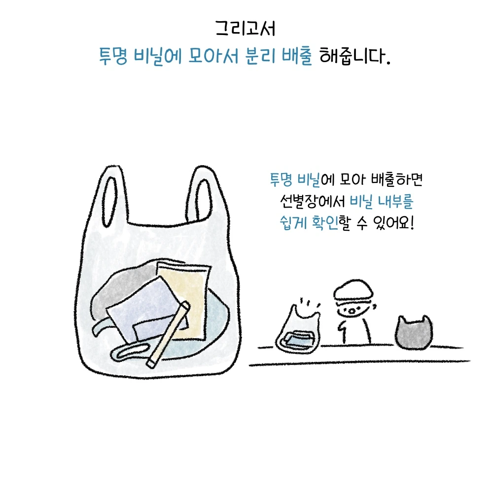 투명 비닐에 모아 배출하면 선별장에서 비닐 내부를 쉽게 확인할 수 있어요!