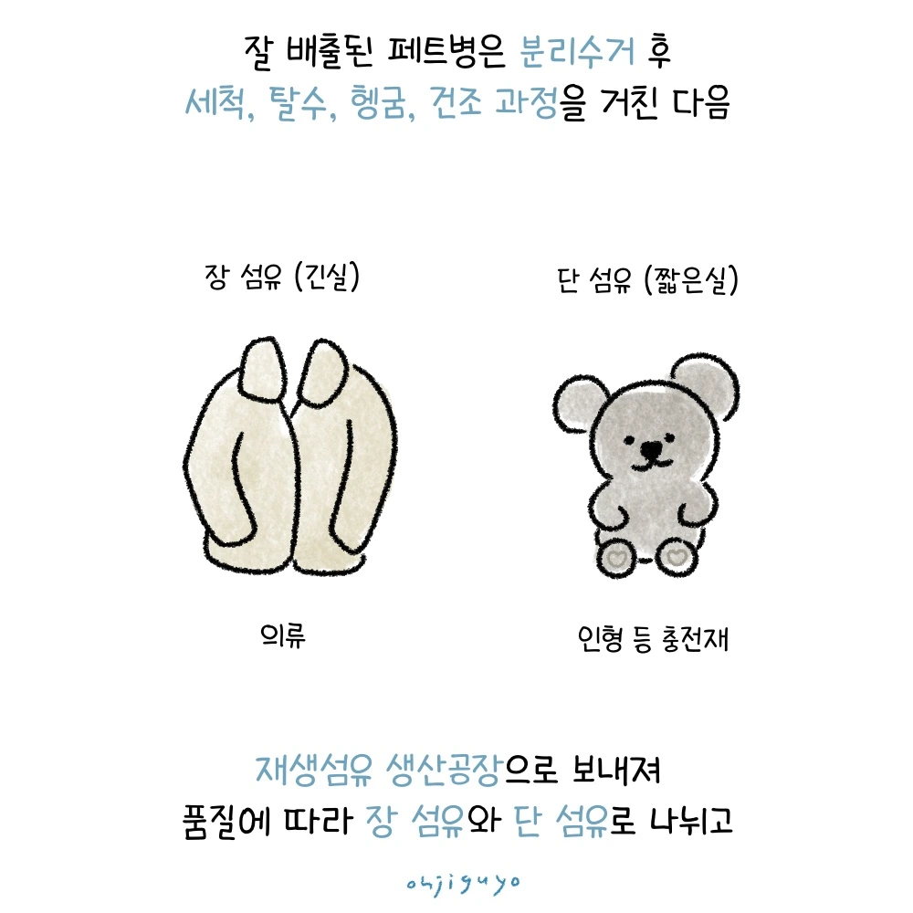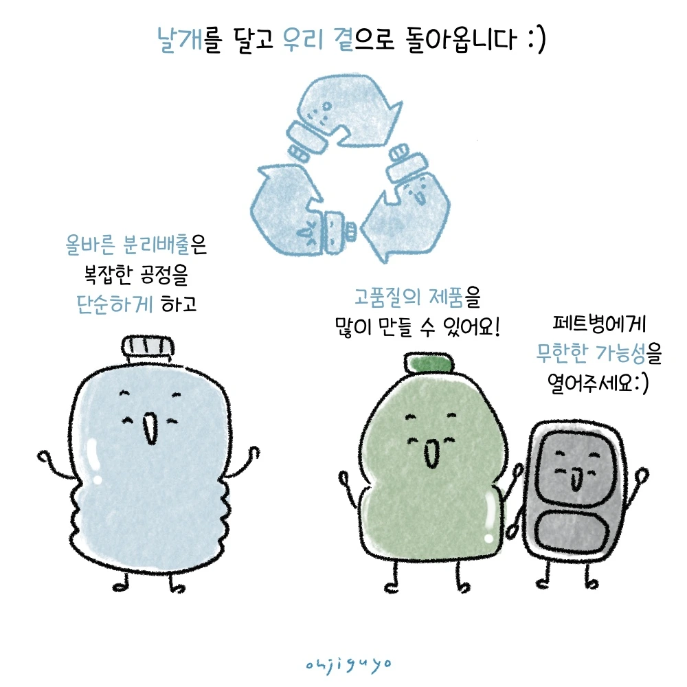 올바른 분리배출은 복잡한 공정을 단순하게 하고 고품질의 제품을 많이 만들 수 있어요! 페트병에게 무한한 가능성을 열어주세요!