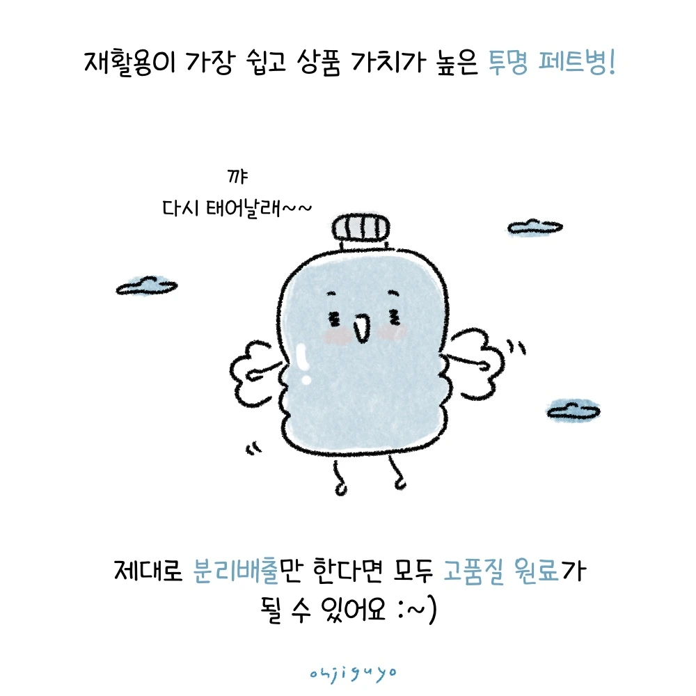 재활용이 가장 쉽고 상품 가치가 높은 투명 페트병! 제대로 분리배출만 한다면 모두 고품질 원료가 될 수 있어요 :~)