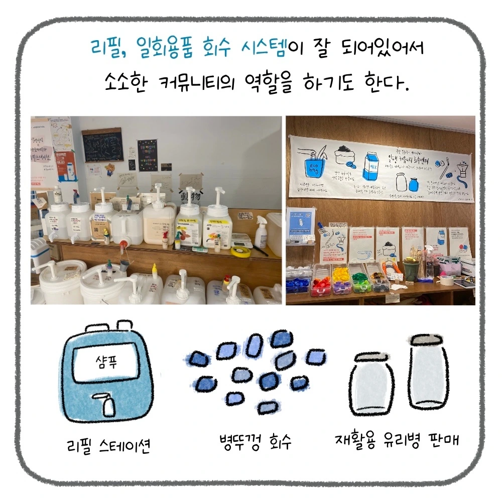 리필, 일회용품 회수 시스템이 잘 되어있어서 소소한 커뮤니티 역할을 하기도 합니다.