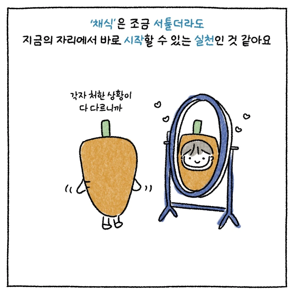 지구에 머무는 한 사람으로서 소비하는 것에 책임을 느끼고 베지테리언이 되었다. 풍요 이면에 감춰진 이들의 고통이 덜어지길 바라며 비폭력적인 삶과 지속가능한 환경을 고민하고 그린다.