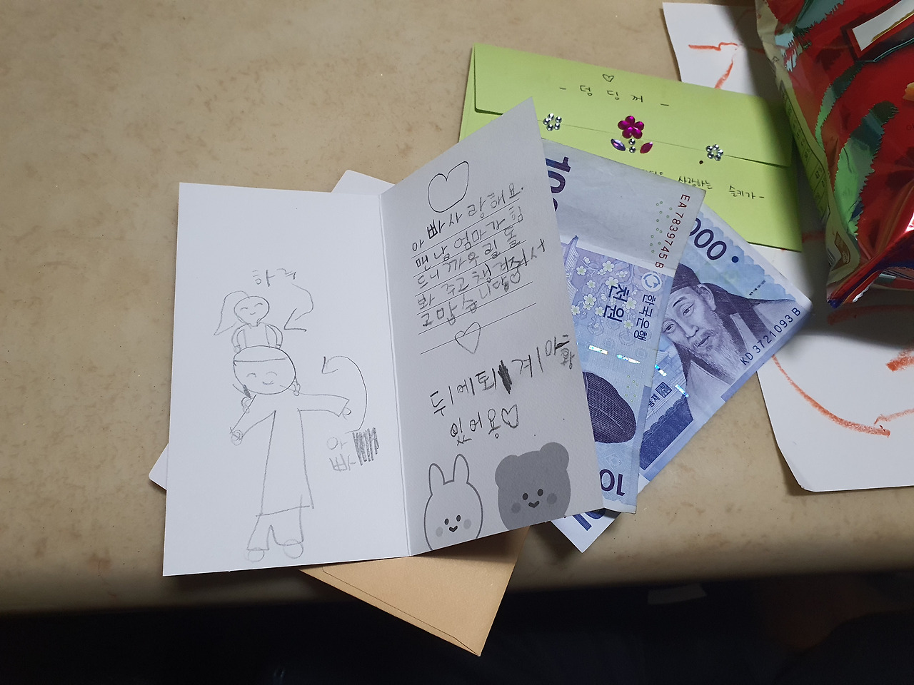 집에 일찍 오냐고 아내가 물었다. 생일이다 보니 야근할 일이 있어도 급하지 않으면 미루겠다는 마음을 일치감치 먹고 퇴근했다. 도착하니 미역국이 끓여져 있었다. 요즘 아내가 입덧 때문에 밥하는 것조차 힘들어하고 있기에 밥상 앞에 앉으니 가슴이 뭉클해졌다. 아이들은 자기들이 그린 그림, 내 생일이라고 만든 클레이에 용돈이라고 2천 원을 챙겨줬는데 올 생일은 내가 유독 감성적인가? 가슴 깊은 곳이 너무 뜨뜻해졌다. 결혼과 출산에 부담을 느끼고 있는 사람들과 사람들과 얘기를 하다 보면 아이들에게 사랑을 주고 돌보는 일에 막연히 자신이 없다고 하는 경우가 있는데, 아이들이 어느 정도 크고 나니 내가 느끼는 것은 오히려 아이들에게 내가 받는 사랑이 주는 사랑보다는 많을 수도 있을 것 같다는 것이다. 아직까지는. 여담이지만 나도 아이들의 사춘기는 두려움이다. 셋째 아이가 태어나면 가족 간에 기념해줄 날도 많아지고 같이 만들 추억도 더 많이 만들 수 있지 않을까 기대를 해본다.
