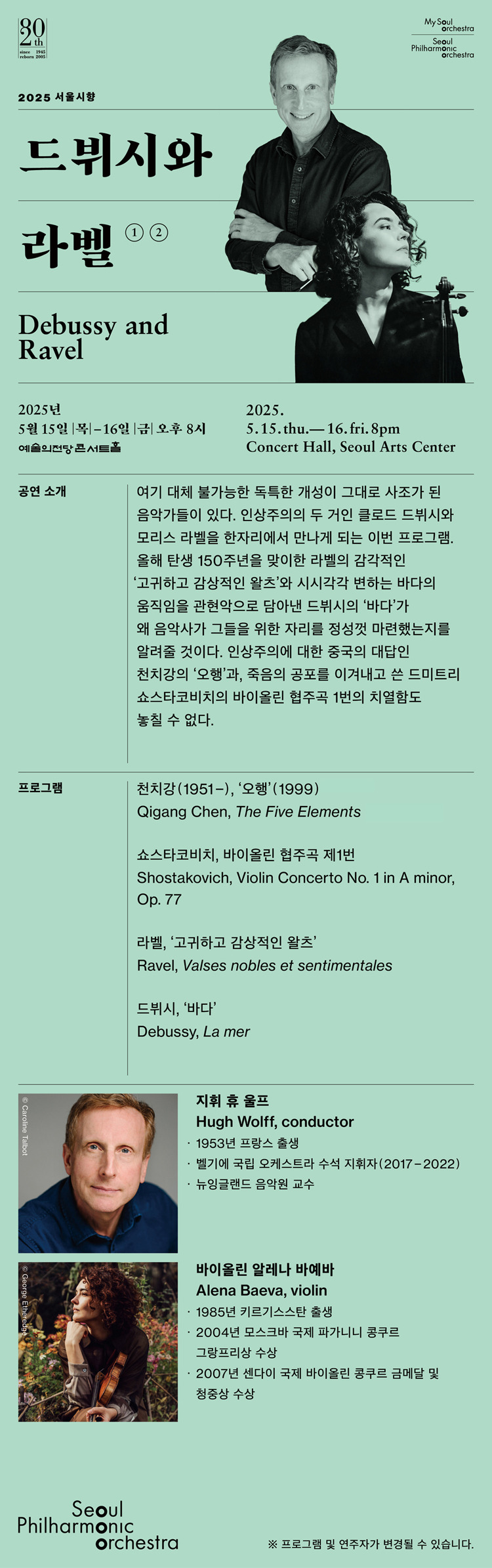 그런 와중에 다시 돌아와 서울시향의 프로그램을 차례로 들었는데, … 놀랍게도 이 프로그램과 엠버와 웨이드의 서사 흐름이 절묘하게 겹쳐진다는 것을 발견했다. 천치강의 오행, 쇼스타코비치의 바이올린 협주곡, 라벨의 왈츠, 그리고 드뷔시의 바다까지—그 네 곡은 단순한 선곡 리스트가 아니라, 엠버와 웨이드의 감정 여정을 다른 언어로 다시 한번 그려낸 듯했다. 도대체 이 네 곡은 어떻게 두 사람의 서사를, 그 다름과 같음의 흐름을 음악으로 들려주는 걸까?