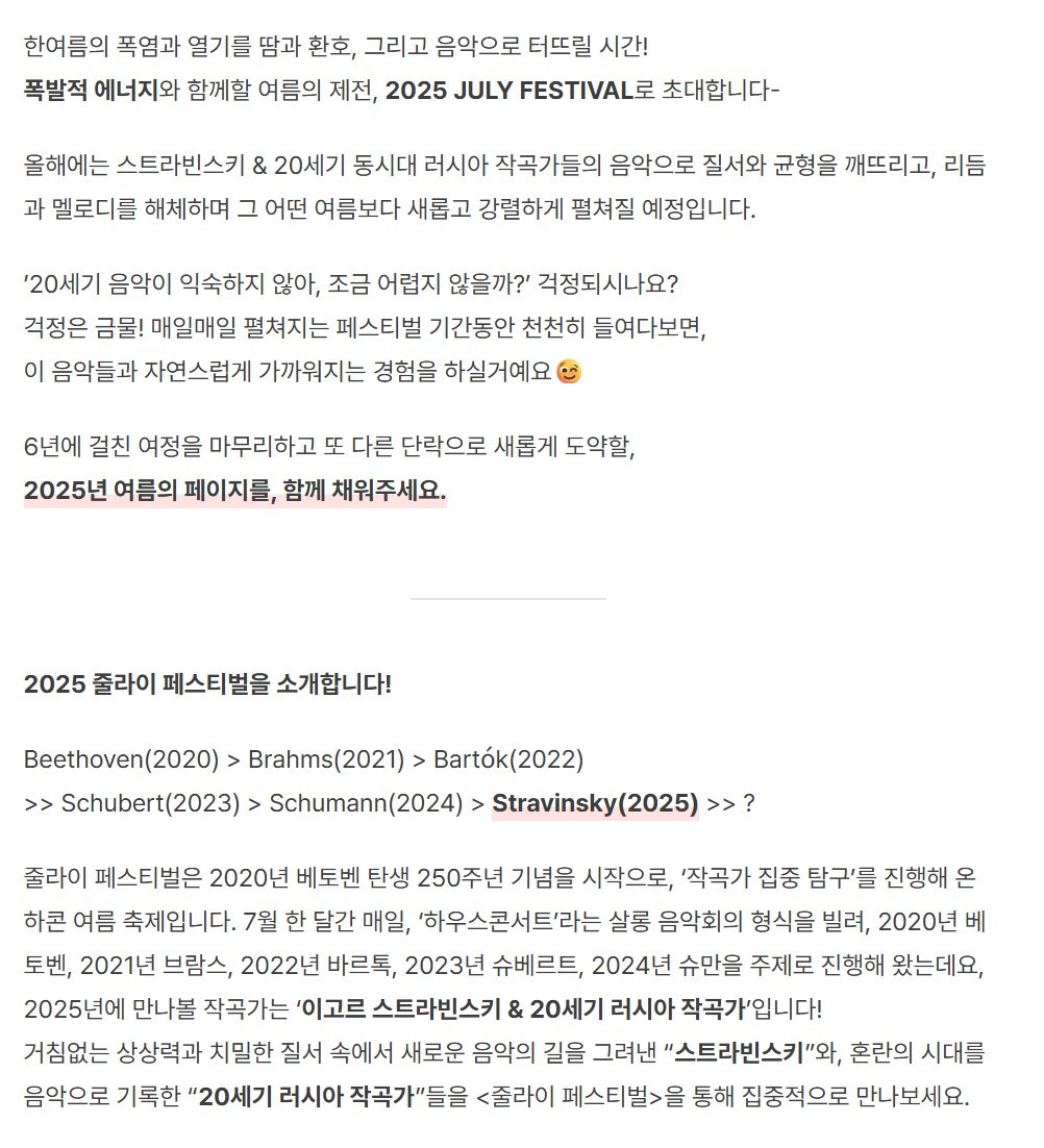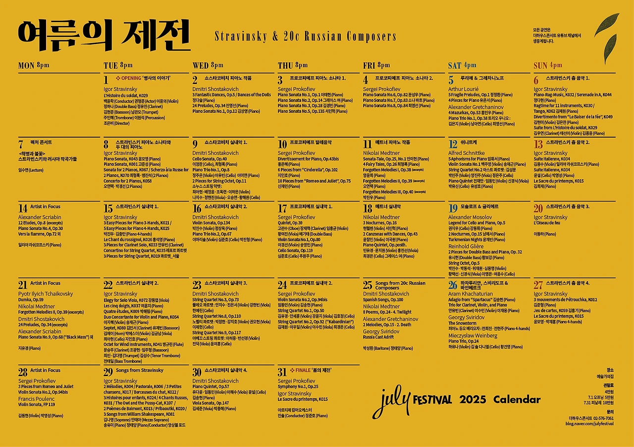 왜 하냐고? 사실은 나도 궁금해서... 어떤 곡을 연주하는지, 어떤 흐름으로 축제가 채워지는지 알고 싶어서다. (예습도 해야 하고!) 이 공연에 특징적인 건, 줄라이 페스티벌의 첫날인 7월 1일과 마지막 날인 7월 31일에는 각각 오프닝과 피날레 콘서트가 준비되어 있다는 점이다. 그 외의 날짜에는 요일마다 집중 조명하는 작곡가가 달라진다. 일정을 정리하면 다음과 같다!