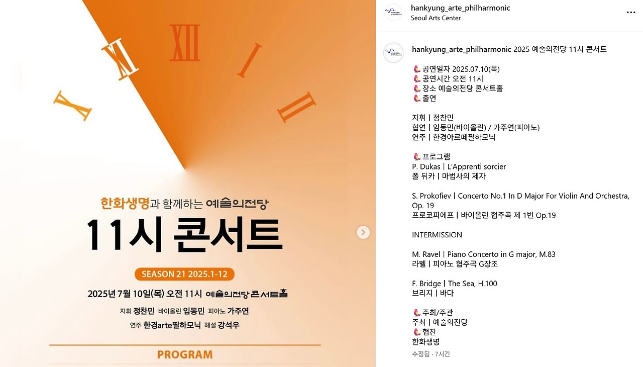 이렇게 하는 둥- 마는 둥- 게으르게 공부를 하다가 한경아르떼필하모닉에서 임동민 바이올리니스트와 협연하는 공연의 인스타그램 게시물을 올리신 거다. 신나는 마음에 리그램하고 유튜브에 그날의 협주곡을 찾아보았다. 근데... 알고 보니 내가 이미 임동민 바이올리니스트 버전의 프로코피예프 바이올린 협주곡 1번을 들어본 적 있다는 사실을 이제야 깨달았다. (바보냐?)