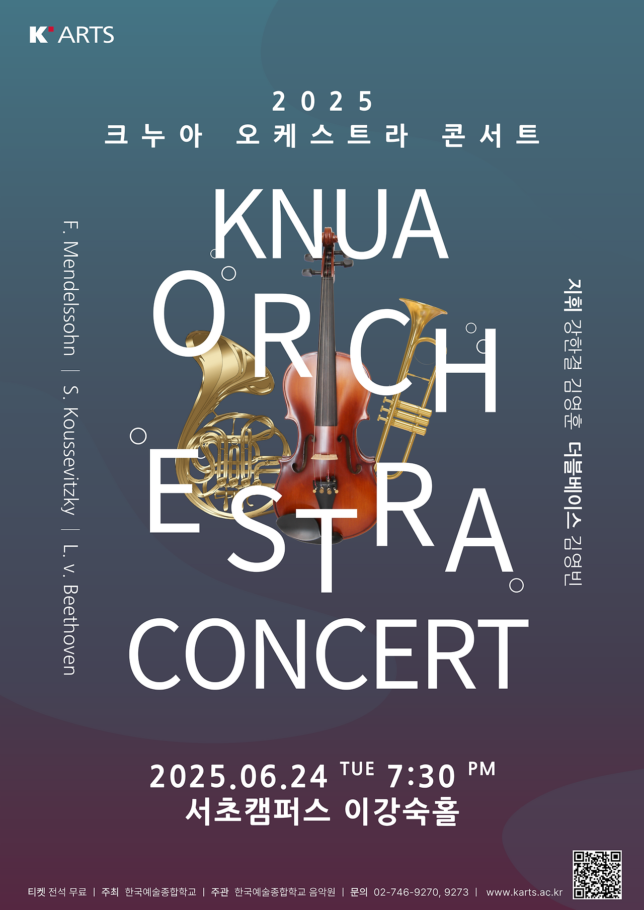 오늘은 예습 없이 들어볼까 했는데, '베토벤 운명'이라는 제목을 보는 순간, "혹시 내가 아는 그 곡 맞나?" 싶어 그냥 플레이리스트에 뇸뇸— 담아버렸다. 이번 공연은 한국예술종합학교 음악원, 크누아 오케스트라의 정기 콘서트다. 장소는 한예종 이강숙홀. 처음 가보는 공간이라 괜히 설렌다..