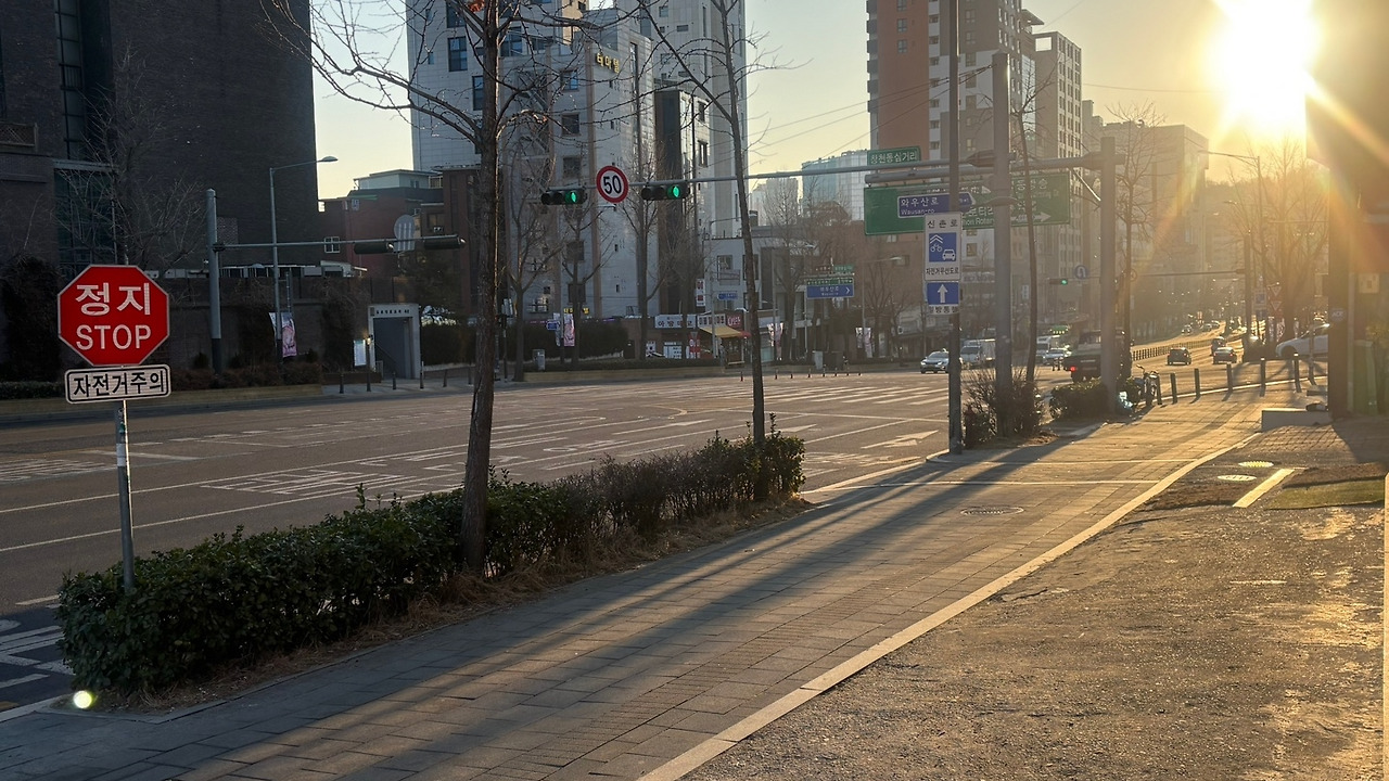 지하철에서 내린 뒤 잠깐의 오르막길을 올라와 내려다보면 넓은 차선의 도로가 펼쳐지는데, 오전 8시 30분의 노란색 햇살이 도로 위와 건물을 넓게 드리워져 있다. 연노란색의 빛이다. 푸른색 그늘 아래에 있던 내가 횡단보도를 건너면서 그 안으로 들어서면 기분과 마음이 참 따뜻하다.
