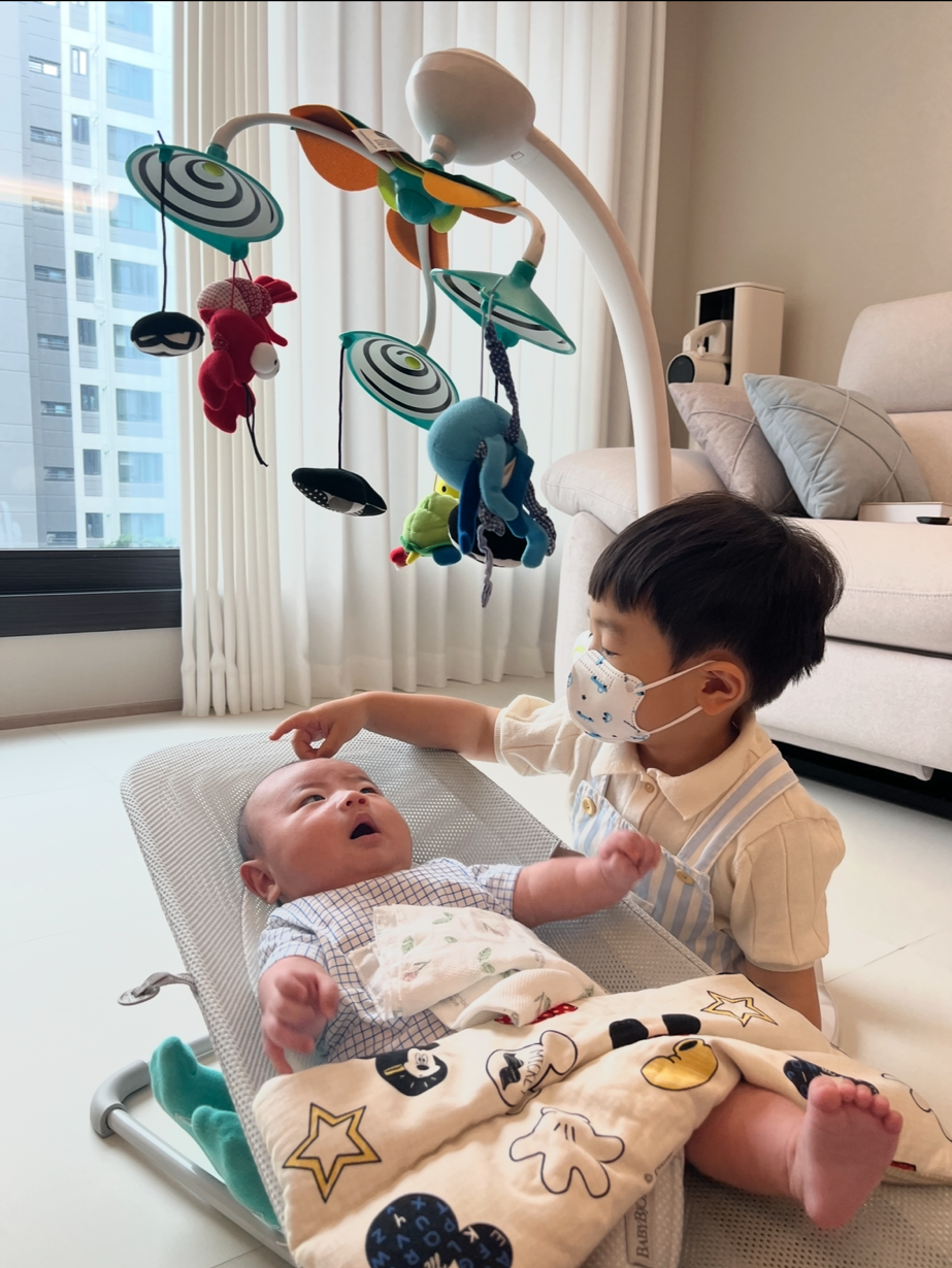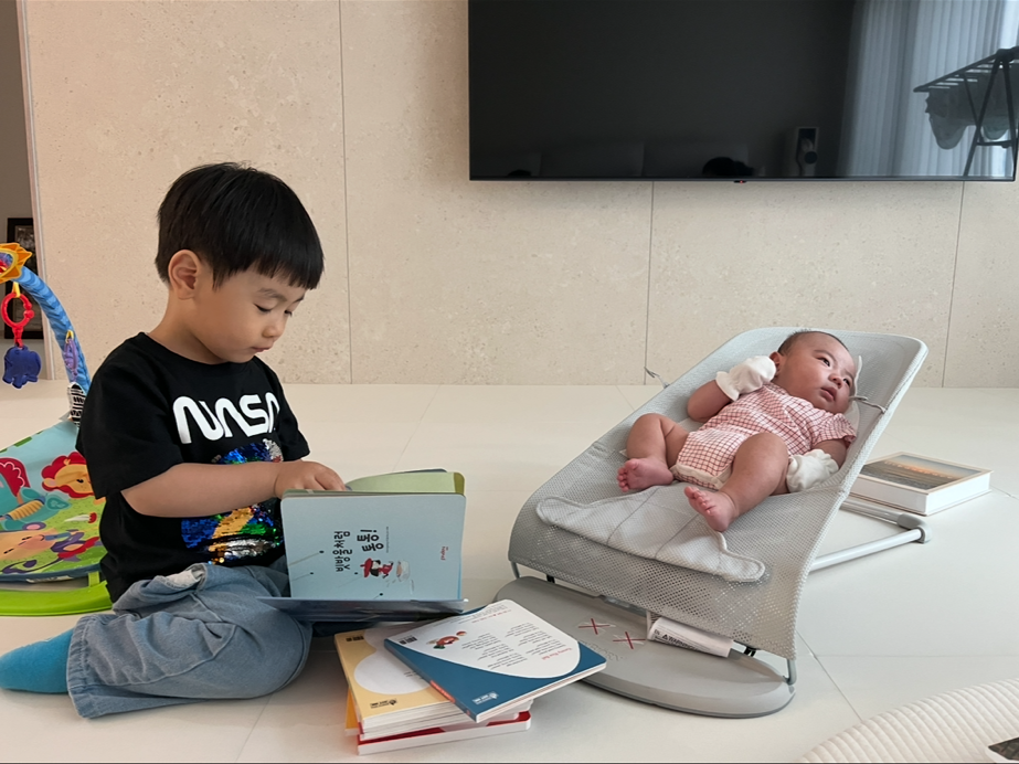 연우와 세 살 차이인 조카는 집에 들어서자마자 아기를 안기 위해 손을 씻었다. 감기를 옮길까 봐 불편한데도 끝까지 작은 마스크를 끼고 콜록거렸다. 그리고 연우를 위해 바운서를 흔들어주고, 그림책을 넘겨주었다. 아직 한글을 떼지 못해 비록 읽어주진 못했지만, 사뭇 진지하게 책을 넘겨주는 게 듬직한 형님의 모습이었다. 연우는 내 동생인데 왜 따로 살아야 하냐는 순수한 질문에 웃음이 터졌다. 요즘 밖에서 자기소개를 할 때면 자기 이름 다음엔 “저는 한 살 동생이 있어요. “를 꼭 덧붙인다던 귀여운 조카다.