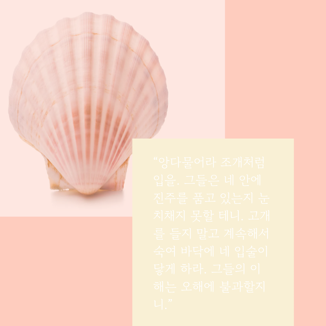 “앙다물어라 조개처럼 입을. 그들은 네 안에 진주를 품고 있는지 눈치채지 못할 테니. 고개를 들지 말고 계속해서 숙여 바닥에 네 입술이 닿게 하라. 그들의 이해는 오해에 불과할지니.”