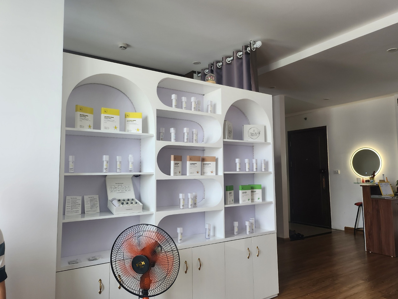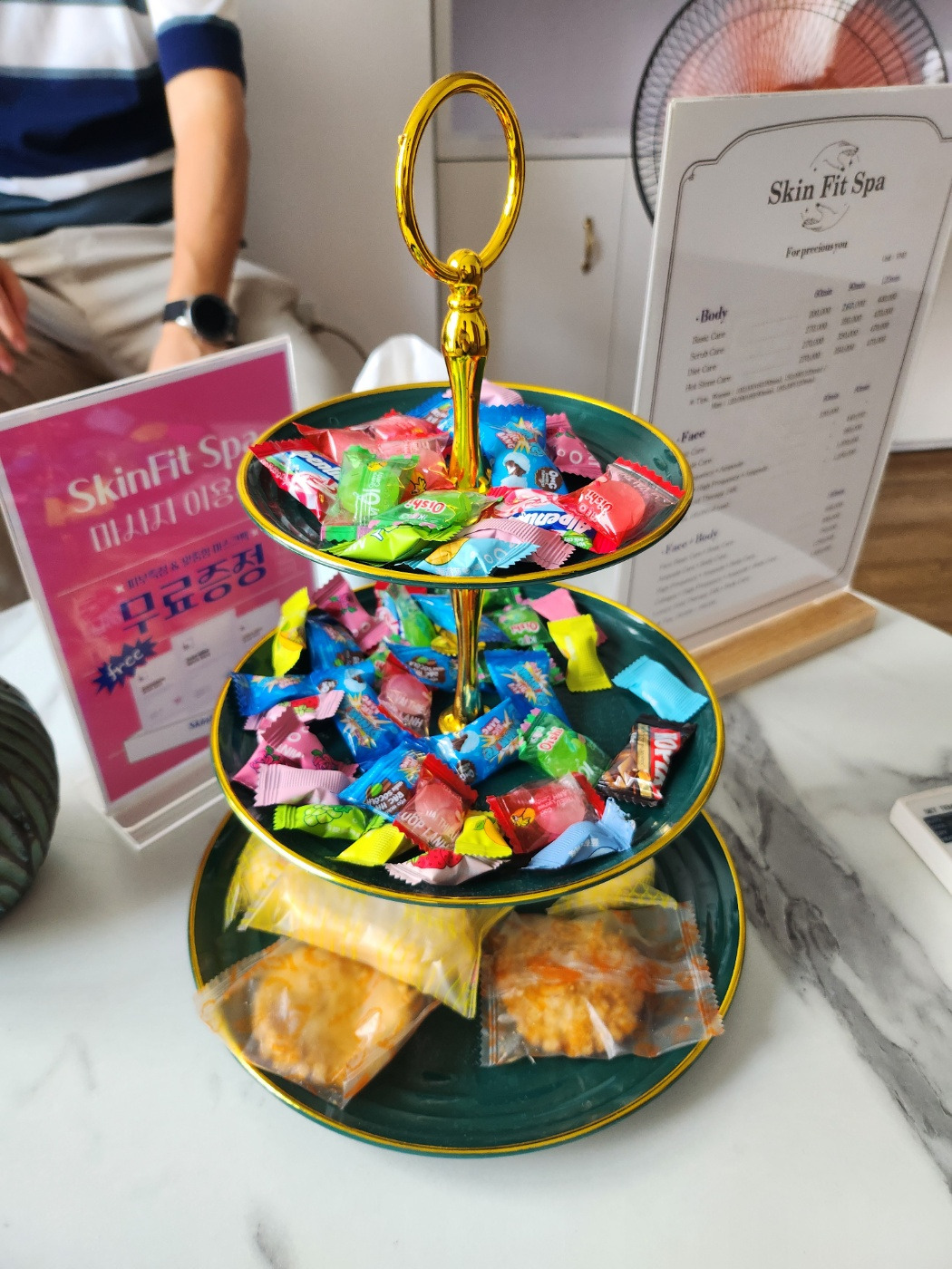 마사지숍으로 들어서자 베트남 여성이 대기할 수 있는 자리로 안내해 줬다. 자리에 앉자마자 애프터눈 티의 3단 스탠드가 보였는데, 대부분 사탕이었다.