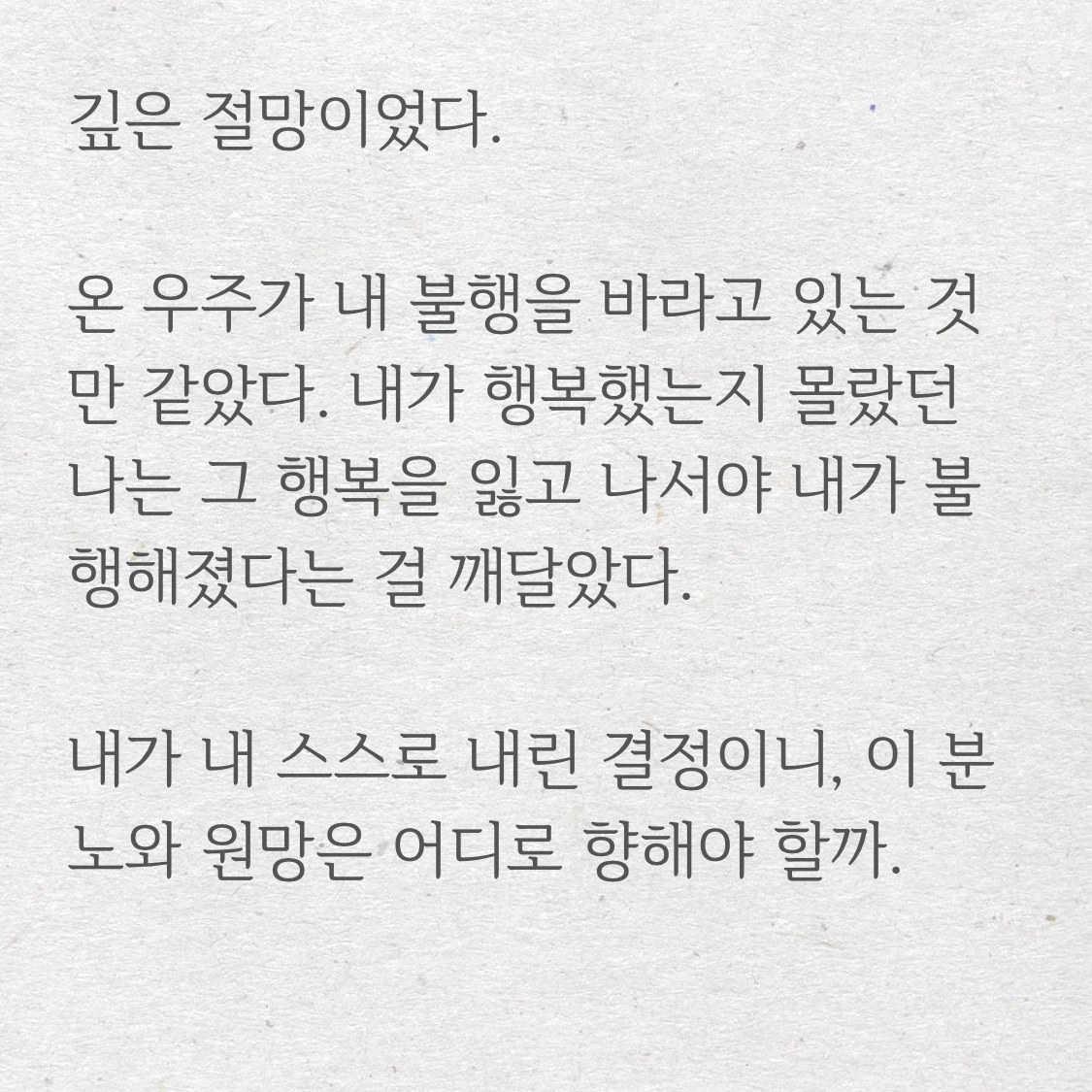아침부터 이렇게 마음이 아픈 걸 보니, 숨도 쉬기 싫은 것을 보니 네가 내 세상이었구나, 네가 내 우주였구나. 나는 이제야 깨닫는다. 너도 그럴까? 이렇게 남남이 되고 나서야 더 잘했어야 했음을 더 노력해봐야 했을 것을, 서로 더 최선을 다해야 했음을 깨달았을까. 너도 그렇게 더 잘하지 못했음을 아쉬워하며 마음 아파하고 있을까.