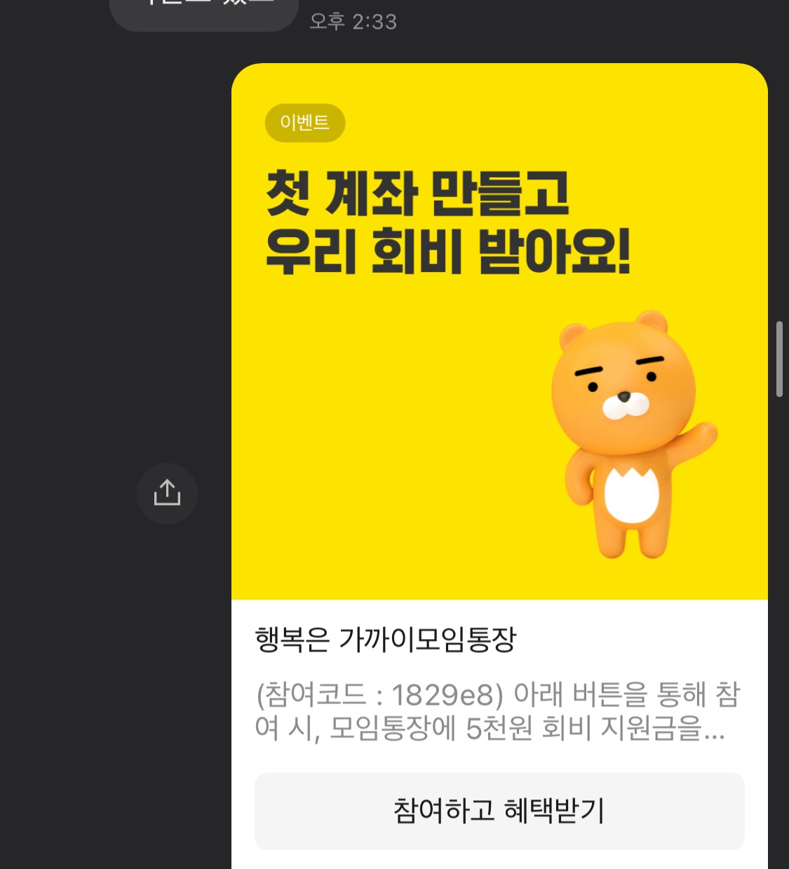 깨깨오 통장에서 알림이 왔다. '모임 통장'이라는 것을 새로이 개설하면 5,000원을 준단다. 생활비 통장이 그렇지 않아도 필요했는데 남편과 둘이 이 통장에 모으면 되겠다는 생각이 번뜩 들었다. 마침 아이 학교 출자금 건으로 남편과 돈을 긁어모아야 하는 시기라, 알뜰하고 지혜로운 나는 바아~로 개설하기로 했다.