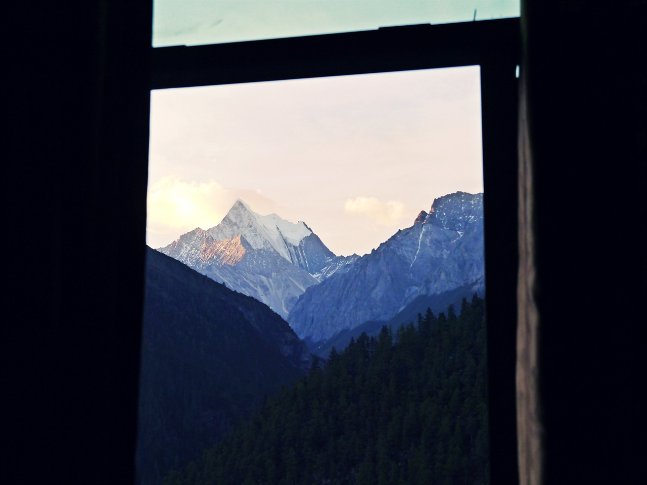 걸음을 옮길수록 호흡이 가빠왔다. 숨을 쌕쌕 몰아쉬며 걷다 보니 어느 틈에 하늘이 파랗게 열렸다. 왼쪽으로 선내일 설산(6032m)이 시야에 들어왔다. 믿기지 않는 비경이었다. 충고사 옆 쉼터에서 바라본 풍경은 알프스에 견주어도 절대 뒤지지 않았다. "아!" 입이 떡 벌어졌다.