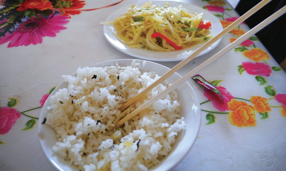 잔뜩 인상을 찌푸리고 있는 내게 한 중국인이 말을 걸어왔다. 앞으로 식사할 곳이 없다며 여기서 점심을 먹어야 한다는 조언이었다. 밥알을 넘기기 위해서는 방금 본 화면을 머릿속에서 깨끗이 지우는 게 급선무였다. 앞으로 7시간을 좁은 버스 안에서 버텨야 했다. 무엇이든 먹어야 했다. 최대한 가벼운 음식인 '미판(밥)'에 감자볶음을 주문했다.