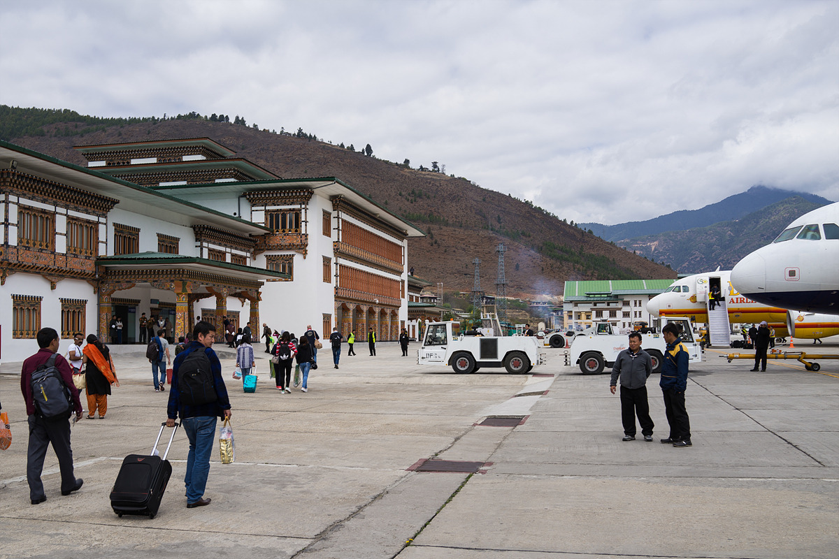 부탄에서 유일한 국제공항의 활주로는 흡사 우리나라 자동차 전용도로와 같은 모습이었다. 공항청사도 우리나라 지방 소도시 시외버스터미널 느낌으로, 모든 입국객이 비행기에 내려 청사까지 걸어 이동하는 게 특징이다. 여행 중 가장 느린 입국 광경이었다.