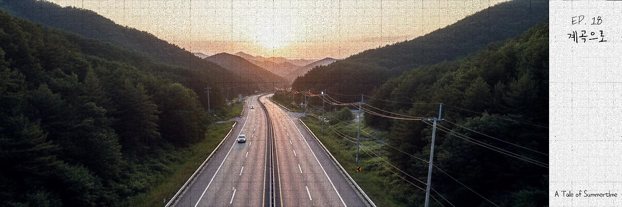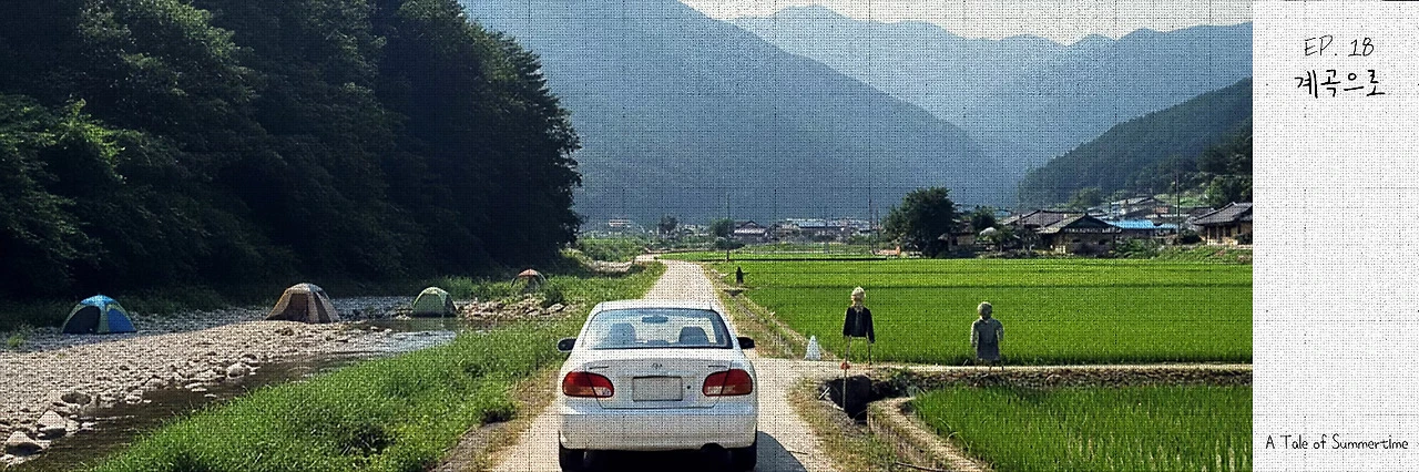 평지에 도달해 농기계 길로 들어섰다. 넓은 평야를 높은 산들이 둘러싸고 있었다. 길 오른쪽으로는 농지가 있었다. 산등성이 밑으로는 오래된 가옥이 마을을 이루고 있었다. 길 왼쪽으로는 야트막한 산 밑에 평평한 계곡이 따라 흘렀다. 야영객들은 자갈밭 곳곳에 텐트를 쳐두고 깨끗한 계곡에 들어가 물놀이를 즐기고 있었다. 튜브를 타는 아이들이 보였다. 성인들은 텐트 앞에서 양은 냄비에 라면을 끓이고 있었다.