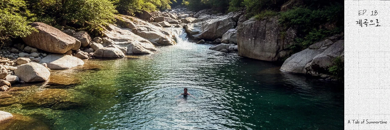 멀찍이 텐트 세 개가 보였고 어른들 몇 명이 부스스한 몰골로 돌아다니고 있었다. 지수는 문득 이 시간이면 학교에서 몇 교시 수업을 듣고 있었을 텐데 하는 생각에 잠겼다. 그때, 텐트에서 나온 수영 팬티만 입은 지수 또래의 한 남자아이가 계곡물로 걸어가더니 준비 동작도 없이 능숙하게 수영했다. 지수는 아이를 바라보며 계곡물에 발을 담갔다. 차가움에 온몸에 찌릿한 전기가 흘렀다. "앗 차가워!"