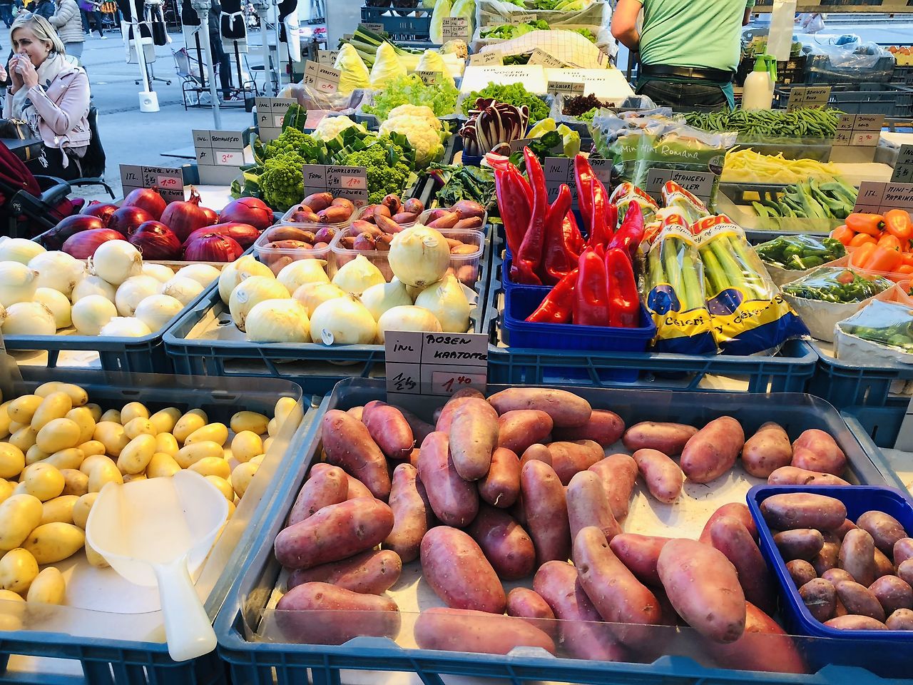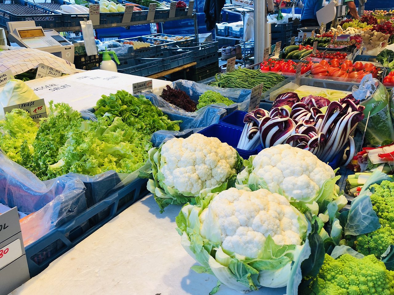 외곽으로 나왔다고는 하지만 잘츠부르크 시내까지 걸어서 3-40분 정도 되는 거리였다. 느긋하게 걸어오면서 돌아오는 길에 있는 마트에 들러서 기념이 될 만한 소금을 사고, 구경을 했다. 시내까지 다 들어왔을 때는 우연히 노상 시장을 발견했는데, 그곳의 채소와 과일들이 무척 싱싱해 보였다. 이름을 모르는 채소들도 많았는데, 특히나 컬리플라워가 탐스럽게 송이송이 진열되어 있는 것이 눈에 들어왔다. 이마트에서는 찔끔찔끔 잘라다가 100g에 3-4천 원씩 파는데, 여기서는 컬리플라워가 양배추와 다를 바가 없는 채소였던 것이다. 우리나라에서는 귀하디 귀한 수입 채소님인데. 언젠가 지금은 우리나라에도 바나나가 흔해 빠진 것과 비슷하게 컬리플라워도 그 정도로 가격이 떨어질 수 있지 않을까 싶기도 하다. 나는 그 싱싱한 과일과 채소들을 그냥 지나치지는 못했고 뭐라도 하나 사고 싶었다. 새로운 과일에 도전해보고 싶기도 했지만 무난하게 적포도 한송이를 샀다. 우리나라 적포도와는 다르게 생겼었고, 매우 싱싱해 보였다. 씻어서 냉장고에 두었다가 알알이 떼어서 봉지에 담아 다음날 프라하에 가면서 먹었는데 아주 탁월한 선택이었다. 특히나 평소에 과일을 잘 먹지 않는 J가 맛있게 먹어서 뿌듯함이 배가 되었다.